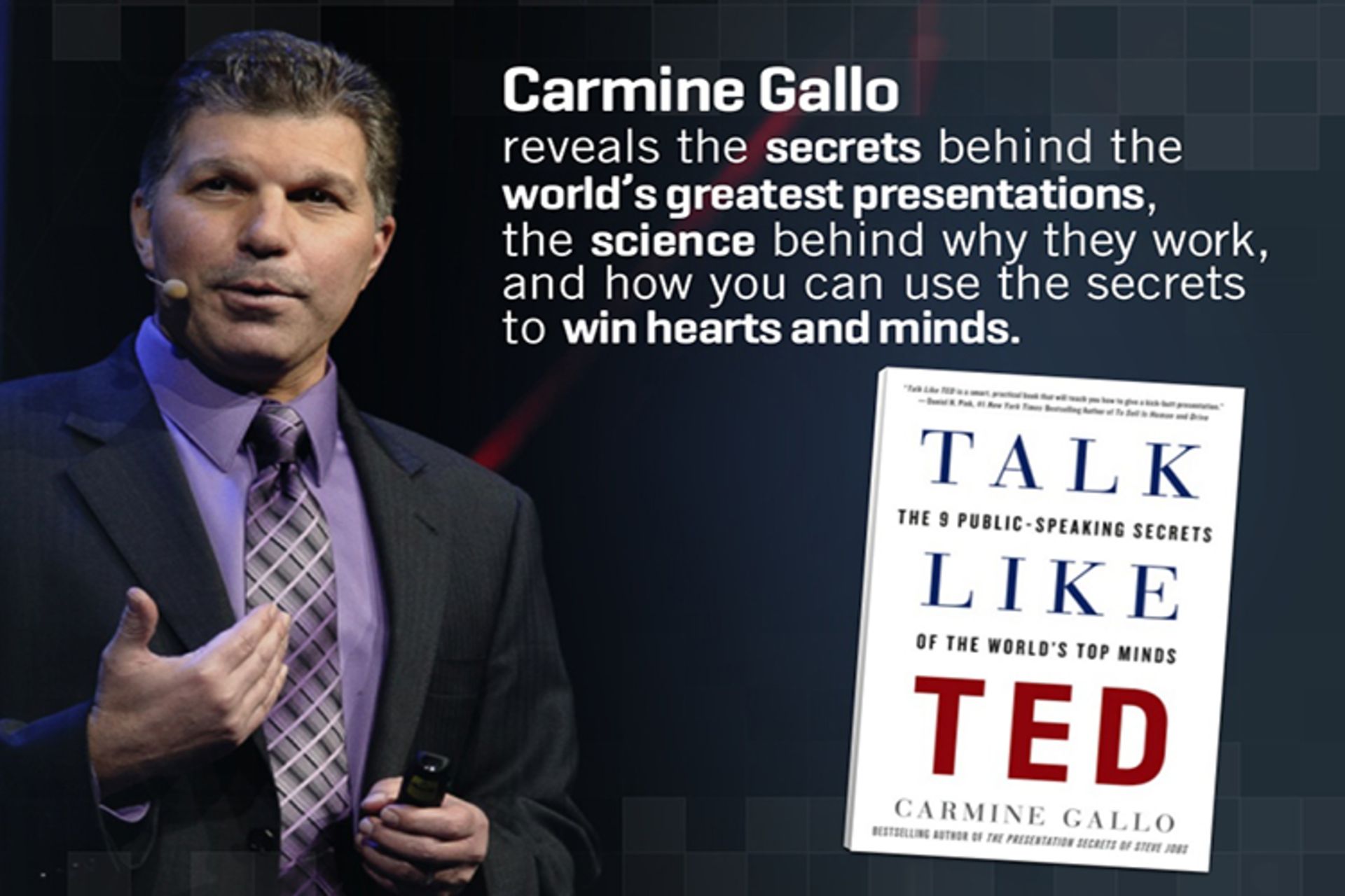 کارمین گالو مدرس و مربی مهارتهای ارتباطی است که با مدیران اجرایی و مدیران عامل شرکتهای بزرگی مانند نوکیا، بانک آمریکا، هوم دیپو و آیبیام همکاری کرده است. از آثار معروف گالو میتوان به کتاب «اسرار نوآوریهای استیو جابز» و «به زبان تد؛ رازهایی برای ارائهی یک سخنرانی بهیادماندنی» اشاره کرد.