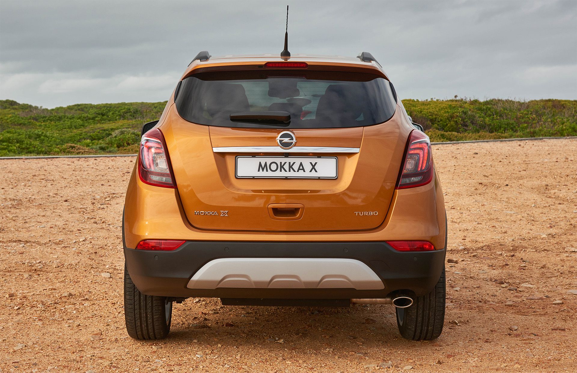 از نمای پشت، طراحی چراغهای عقب با حالت قطرهای همراه است که هرچند بیش از حد، بزرگ دیده میشوند، اسپرت و متناسب با دیگر اجزاء هستند. بالچهی عقب همراه با چراغ ترمز، کاملا در امتداد شیب سقف قرار دارد و با توجه به تورفتگی درب صندوق عقب، تقارن خوبی به وجود آورده است. در موکا ایکس، محل مناسبی برای دستگیرهی در صندوق و پلاک راننده دیده میشود که همراه با لوگوی اوپل، بخش میانی را پر میکنند. طراحی کاپوت عقب، به سادگی رها نشده است و با خطوط حجمدهندهی متعدد از کنار شیشهی عقب تا دستگیره و همچنین در قسمت مخصوص پلاک ارائه میشود. بخش پایینی سپر عقب پلاستیکی است؛ اما شبیه به سپر جلو، از قطعهای نقرهای رنگ استفاده میکند؛ ضمن اینکه دو چراغ هشداردهنده نیز در گوشههای آن قرار دارند.