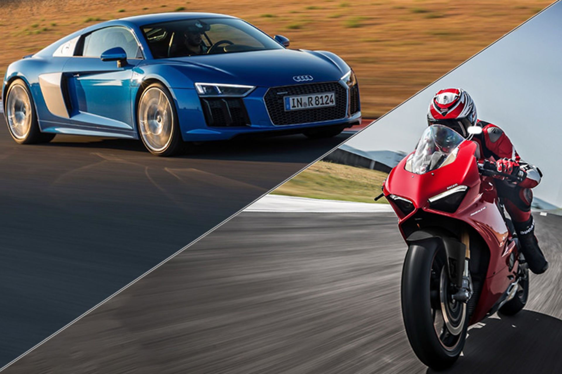 پانیگاله V4 در حالت پر بودن باک بنزین، فقط ۱۹۸ کیلوگرم (نسخهی S وزن کمتری دارد) وزن دارد. این عدد را در برابر وزن ۱۶۴۰ کیلوگرمی آئودی R8 قرار دهید تا تفاوت کلی مشخص شود. علاوه بر وزن کمتر، پانیگاله V4 به انواع تجهیزات مدرن مانند گیربکس پرسرعت دوکاتی، حالتهای مختلف سواری و ازهمه مهمتر، سیستم کنترل شروع حرکت (لانچ کنترل) مجهز است.در مقابل آئودی R8 از سیستم تمام چرخ محرک و کنترل شروع حرکت استفاده میکند. تمام چرخ محرک بودن R8 میتواند عامل مهمی در برابر وزن کمتر پانیگاله V4 باشد. تیم اتوکار زمان هر دو مدل را در سرعتهای ۱۰۰ و ۱۶۰ کیلومتر بر ساعت در مسیر ۴۰۰ و ۸۰۰ متری ثبت میکند.