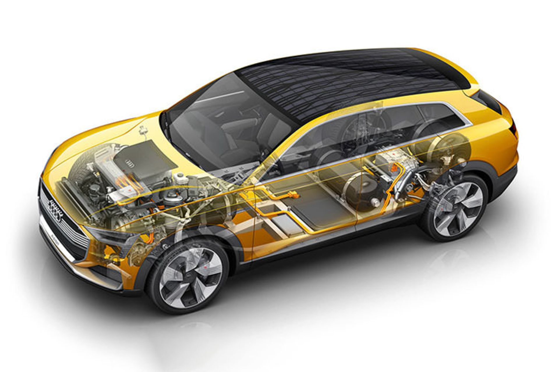 آئودی در سال ۲۰۱۶، خودرو مفهومی پیل سوختی h-tron را رونمایی کرد که شعاع حرکتی آن به ۶۰۰ کیلومتر میرسید. مهمترین ویژگی این خودرو زمان سوختگیری چهاردقیقهای بود. تصمیم آئودی برای پیشبرد و توسعهی پیل سوختی هیدروژنی در راستای سرمایهگذاری حدود ۱۵ میلیارد دلاری است. آئودی قصد دارد تا سال ۲۰۲۵، حدود ۱۲ خودرو کاملا الکتریکی مجهز به باتری تولید کند.