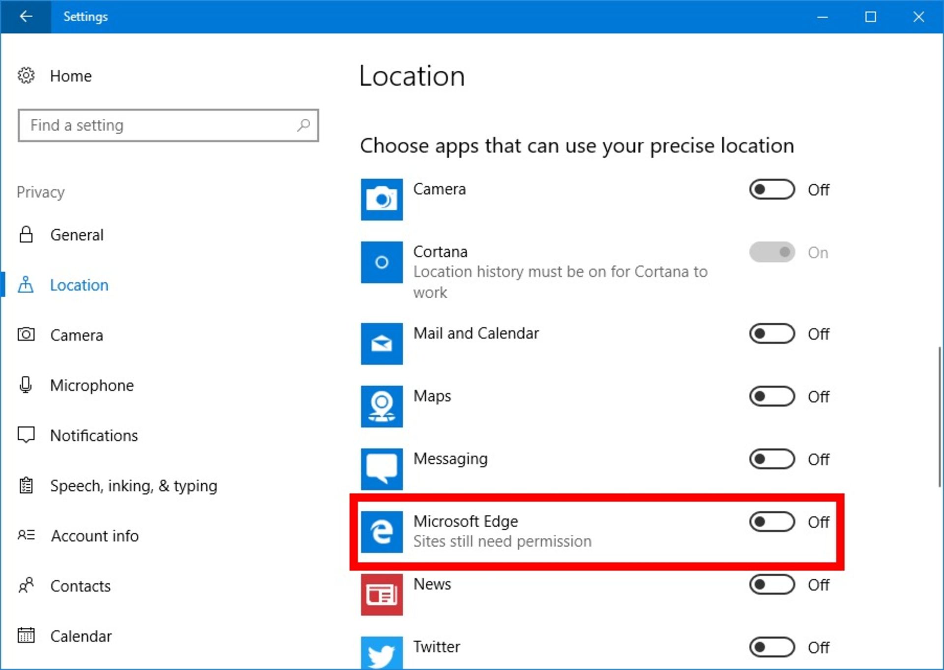 بهتر است با سادهترین گزینه شروع کنیم؛ چرا که مرورگر اج بر پایهی پلتفرم ویندوز استور ساخته شده است و میتوان بهسادگی درخواست موقعیت مکانی را غیرفعال کرد. کافی است وارد آدرس Settings --> Privacy --> Location شوید. صفحه را به سمت پایین اسکرول کنید تا به گزینهی Choose apps that can use your location برسید. اکنون باید اسلایدر مربوط به اج را روی off قرار دهید.
