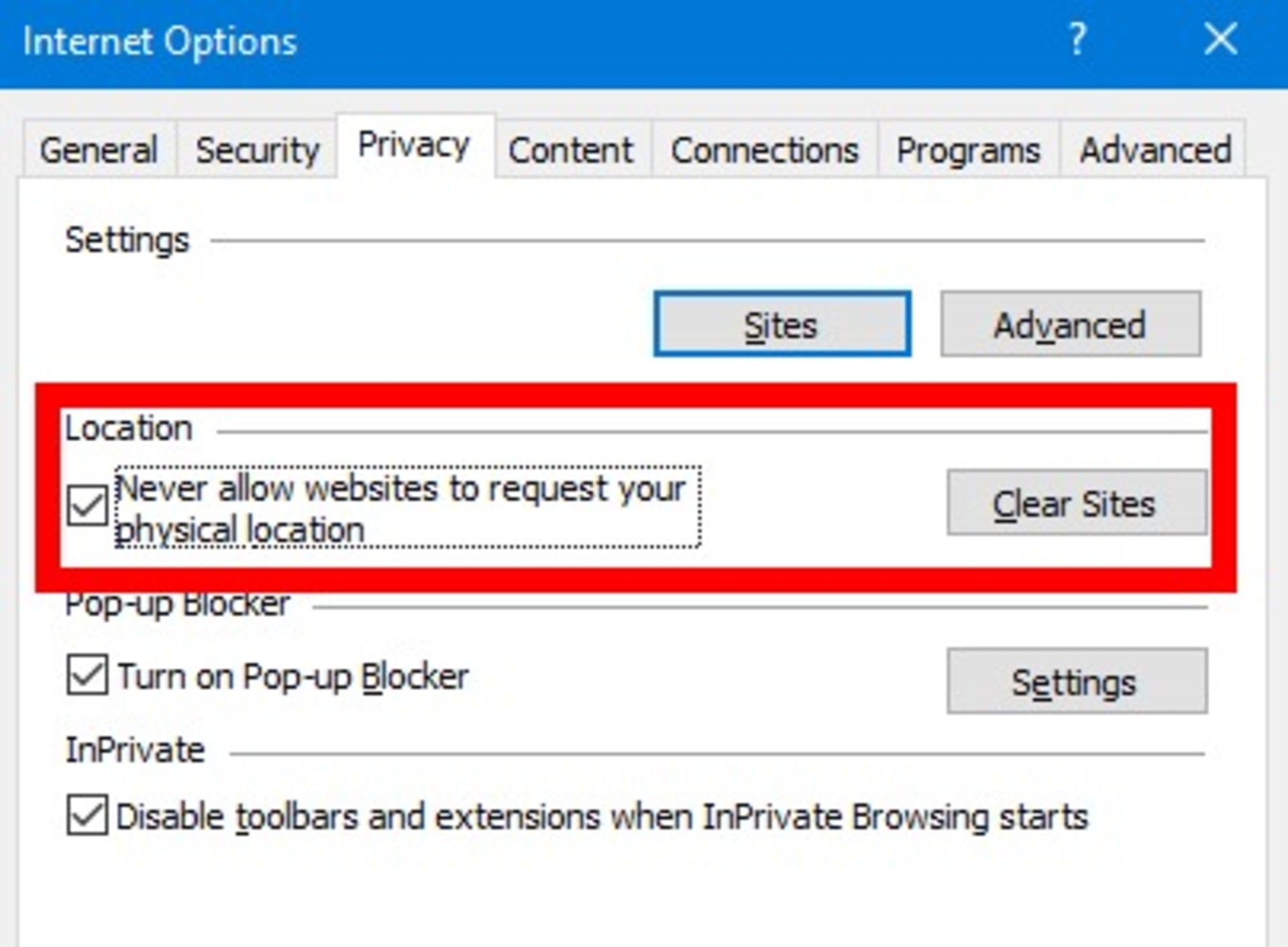 اگر همچنان از اینترنت اکسپلورر استفاده میکنید، میتوانید درخواست ثبت موقعیت مکانی را غیرفعال کنید. این روش برای اینترنت اکسپلورر ۱۱ است. در قسمت سمت راست بالا روی آیکون تنظیمات کلیک کنید. از منوی بازشده Internet Options را انتخاب کنید. در پنجرهی بازشده تب Privacy را انتخاب کنید و تیک گزینهی Never allow websites to request your physical location را از قسمت Location بزنید. اکنون روی Apply و سپس OK کلیک کنید.
