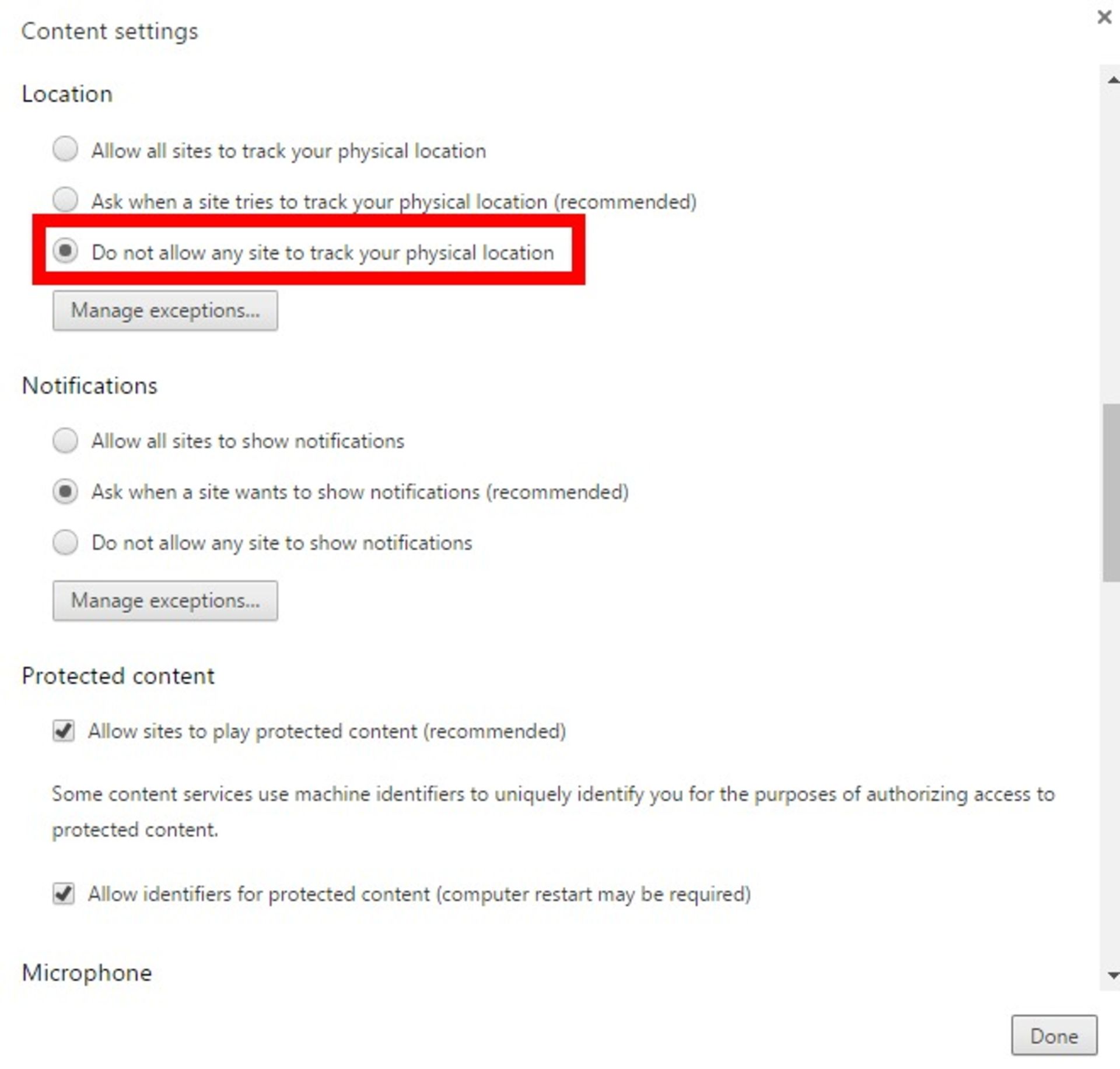 در مرورگر کروم باید روی آیکون منو (آیکون سهنقطهی عمودی) در سمت راست نوار آدرس کلیک کنید. از منوی بازشده گزینهی Settings را انتخاب کنید. در انتهای این منو روی Show Advanced و سپس مسیر Privacy --> Contetnt کلیک کنید تا پنجره پاپآپ باز شود. صفحه را اسکرول کنید به بخش Location برسید و سپس روی گزینهی Do not aloow any site to track your physical location کلیک کنید. اکنون روی Done کلیک کنید.