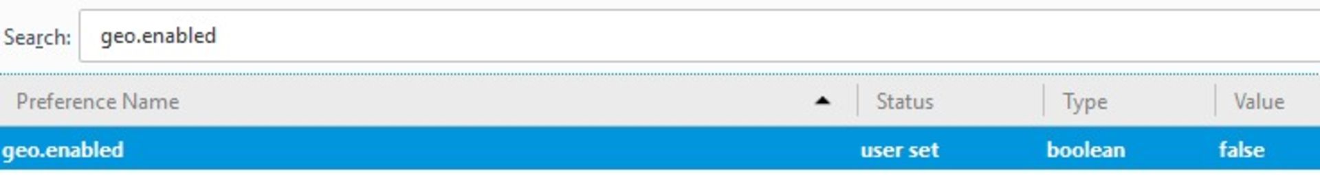 سپس عبارت geo.enabled را در کادر جستجو وارد کنید و کلید اینتر را بزنید. فقط گزینهی مورد نظر به شما نشان داده میشود که با دو بار کلیک کردن روی آن میتوانید تنظیمات را غیرفعال کنید. زمانی موقعیت مکانی غیرفعال میشود که زیر گزینهی Value مقدار false درج شود.
