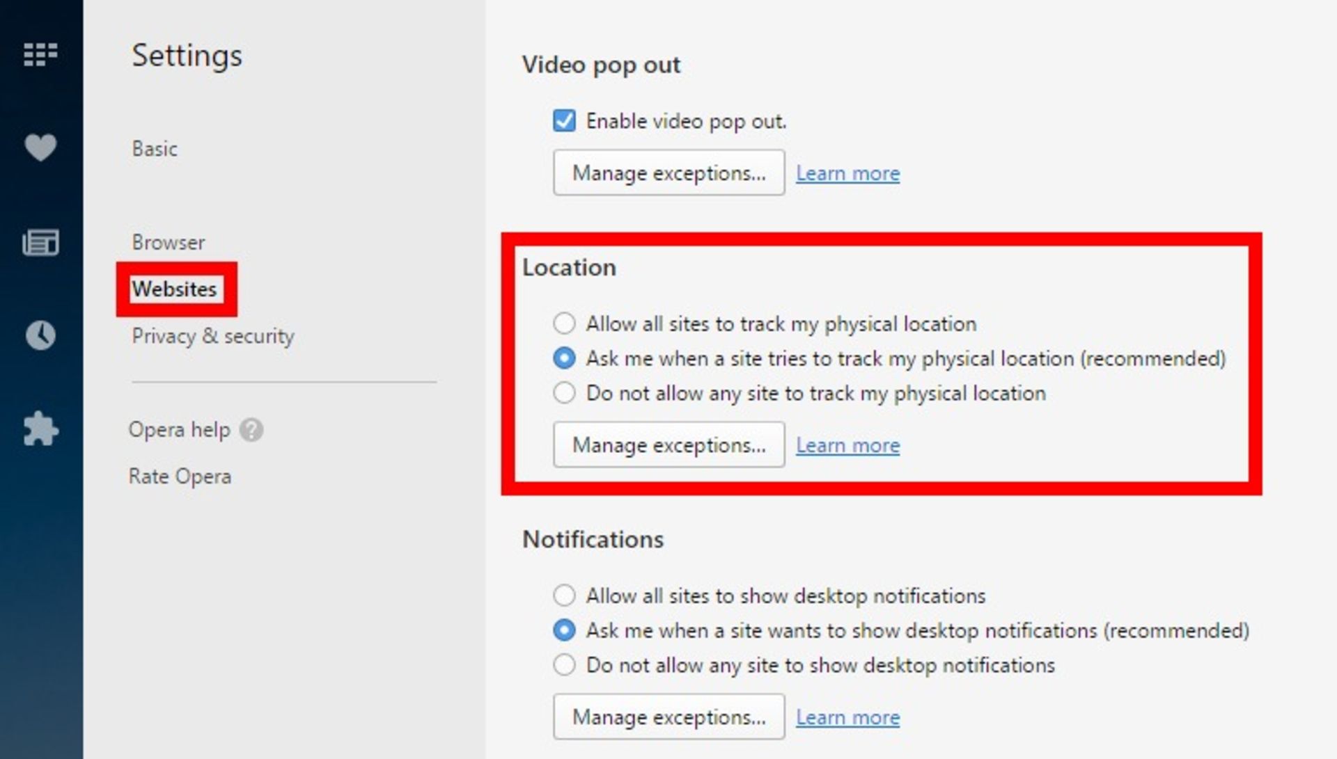 اپرا مرورگر بعدی است که به آن میپردازیم. این مرورگر از همان هستهی کروم استفاده میکند و در نتیجه تنظیمات آنها مشابه است. روی منو در گوشهی بالا سمت چپ کلیک کنید و از منوی بازشده روی Settings بزنید. در تبهای بازشده روی Websites از ستون سمت چپ کلیک کنید. در قسمت Location روی گزینهای با برچسب Do not allow any site to track my phisycal location بزنید.