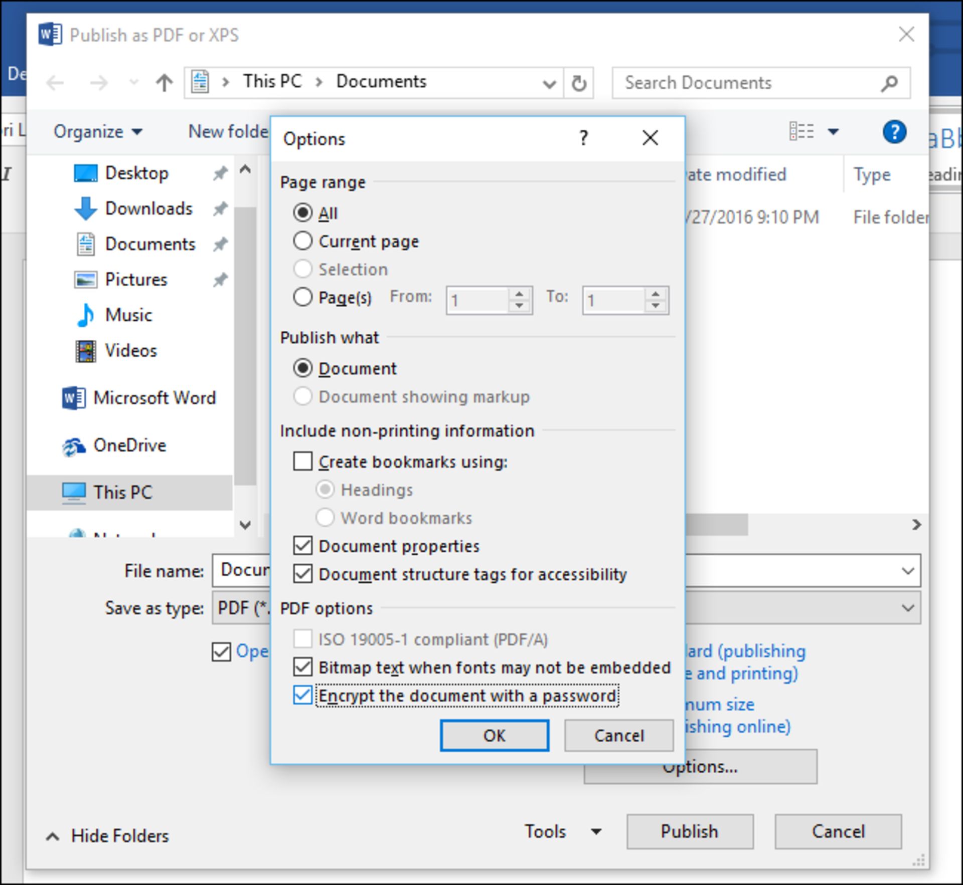 شما میتوانید یک سند آفیس را بهصورت فایل PDF خروجی گرفته و فایل PDF را رمزگذاری کنید. فایل PDF با رمزی مدنظر شما رمزگذاری خواهد شد. این قابلیت در مایکروسافت ورد، اکسل و پاورپوینت وجود دارد.