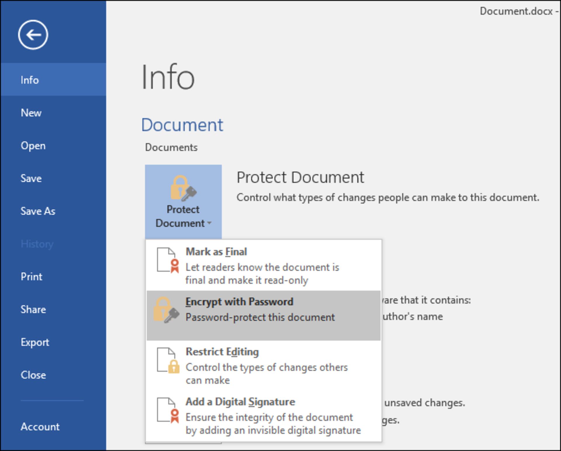 برای رمزگذاری یک سند در ورد، اکسل، پاورپوینت و اکسل، ابتدا فایل را باز کنید. سپس روی منوی File در گوشه بالا و چپ صفحه کلیک کنید. در زبانه Info، روی دکمه Protect Document کلیک کرده و Encrypt with Password را انتخاب کنید.