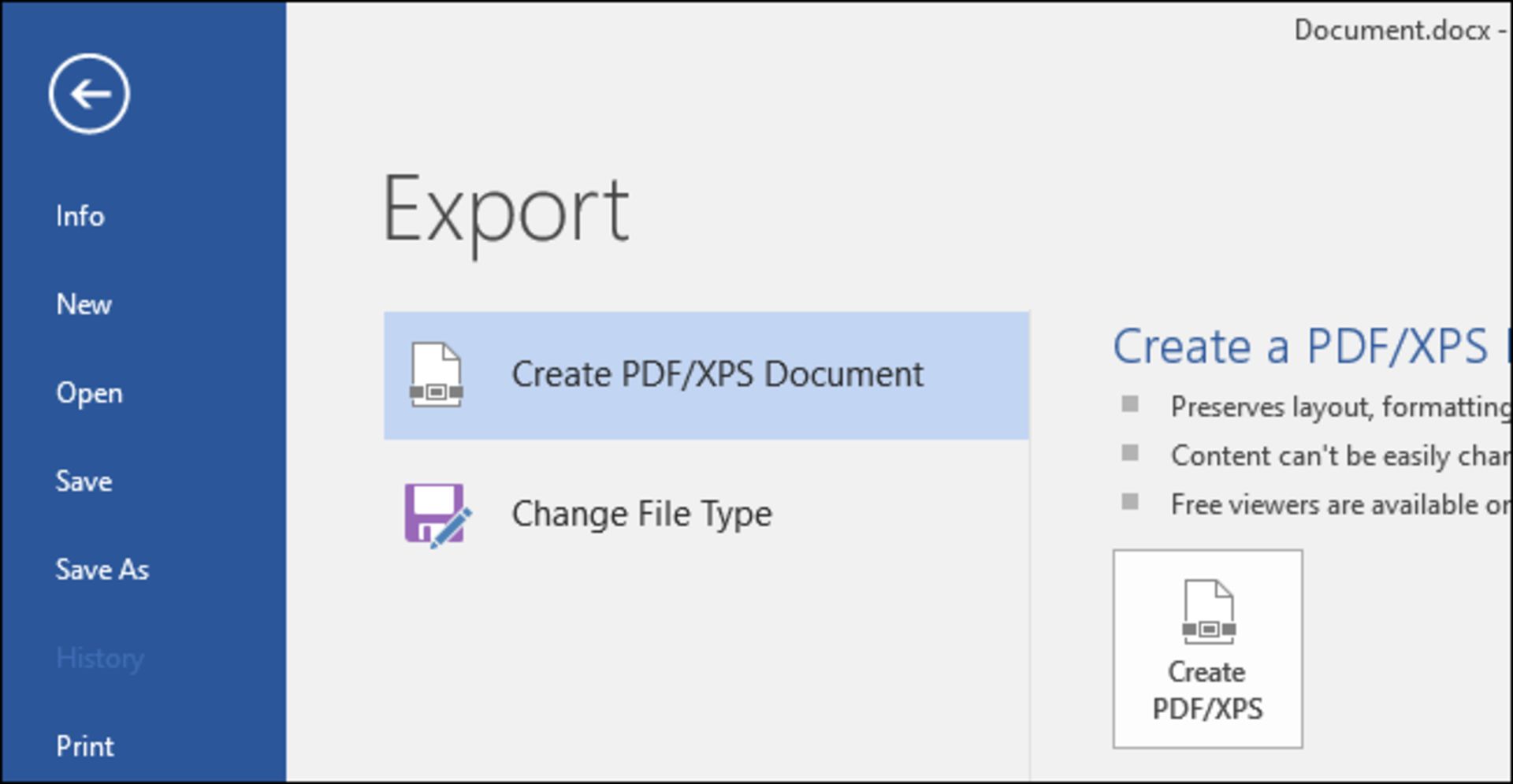 برای استفاده از این امکان، فایل مورد نظر خود را باز کرده و روی گزینه File در منو کلیک کنید. حال گزینه Export را انتخاب کنید. روی دکمه Create PDF/XPS کلیک کنید تا از فایلتان بهصورت فایل PDF خروجی گرفته شود.