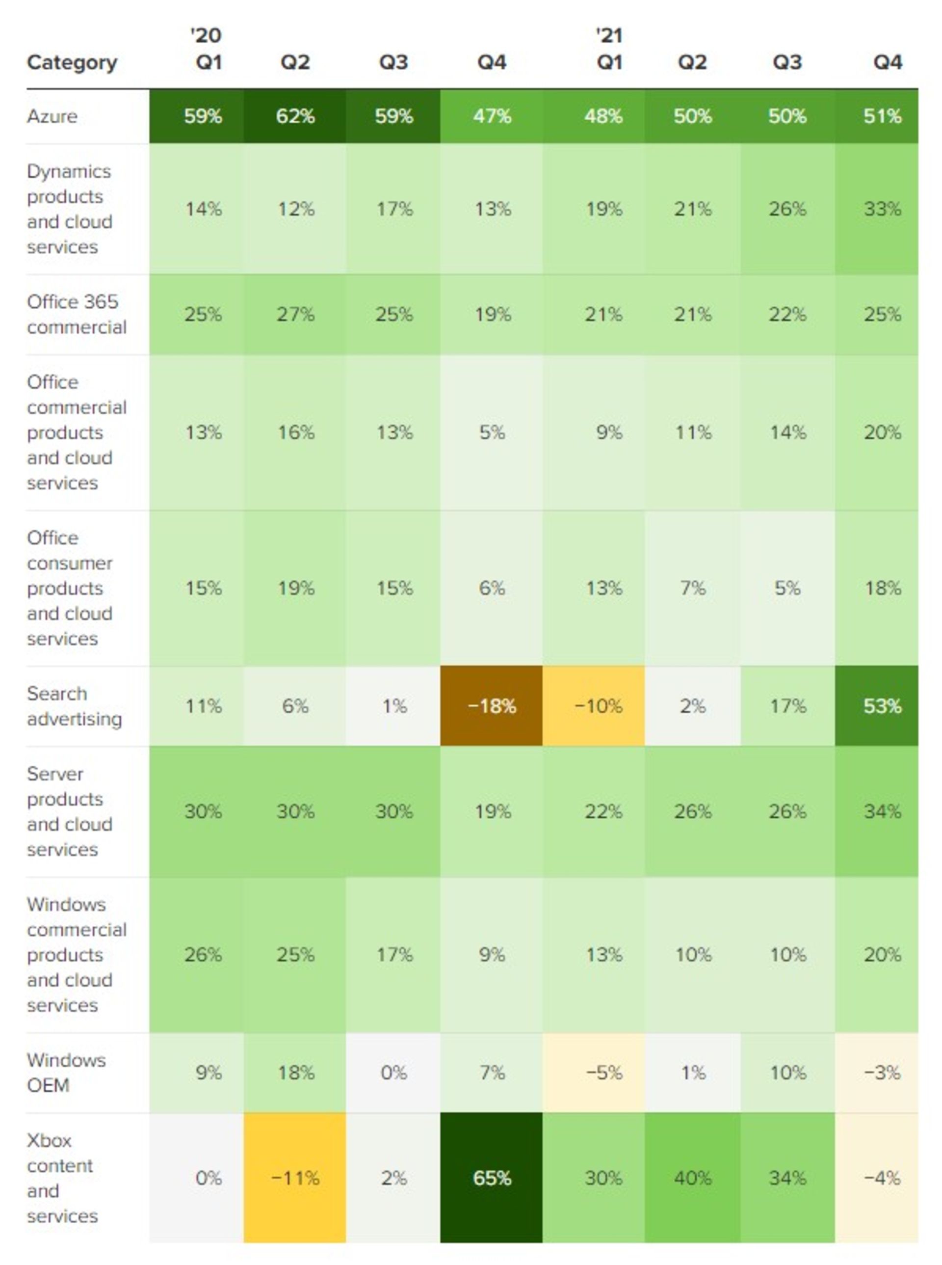 - بهرهوری و فرایندهای تجاری: ۲۱ درصد رشد، متأثر از لینکدین (رشد ۴۶ درصدی) و محصولات داینامیک ۳۶۵ (۴۹ درصد رشد)
