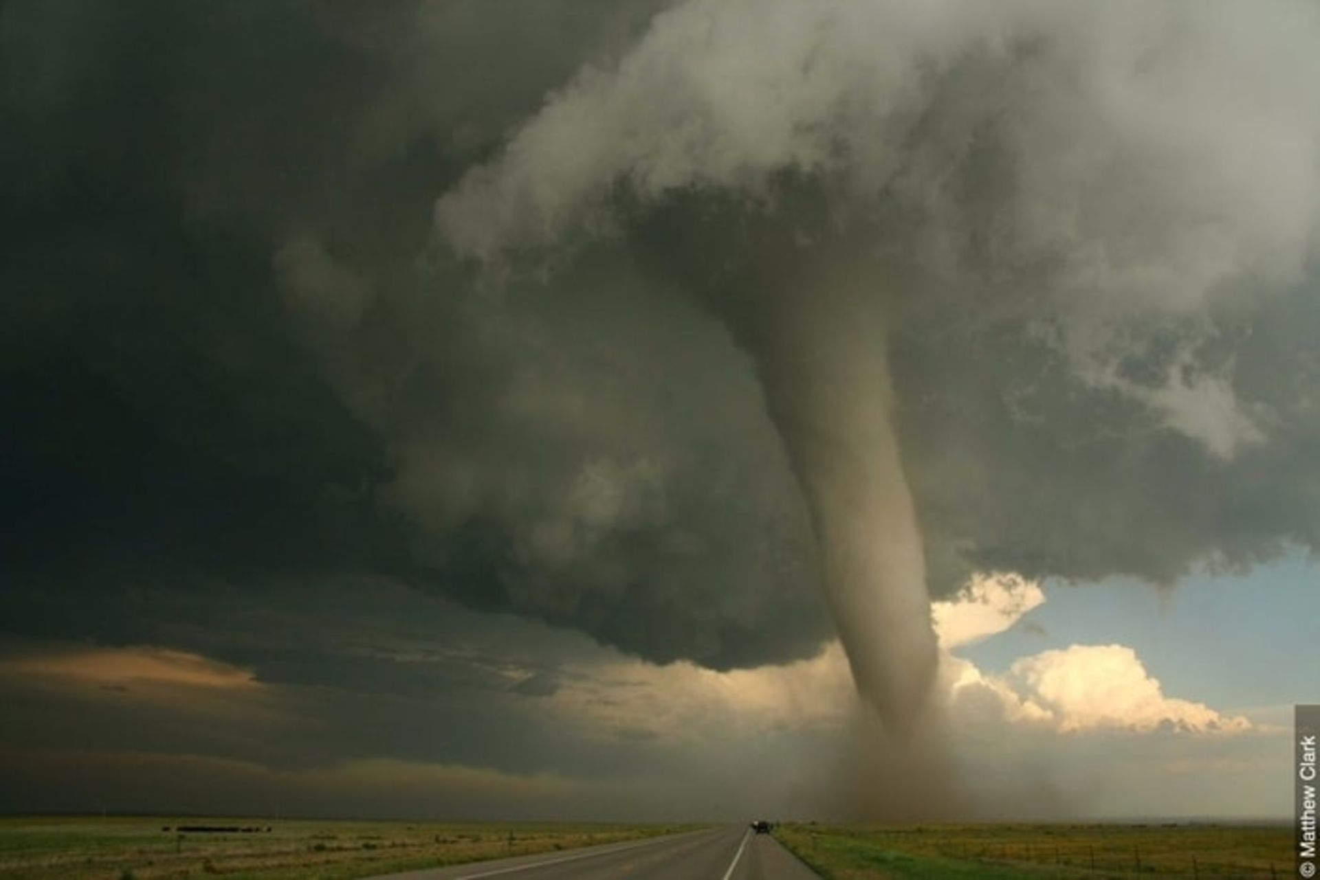 تورنادوها وقتی ایجاد میشوند که هوای چرخان زیر ابرهای کومولونیمبوس با سطح زمین تماس پیدا کند. این تورنادو به خاطر گرد و خاکی که با خود حمل میکند، قهوهای-قرمز به نظر میرسد.