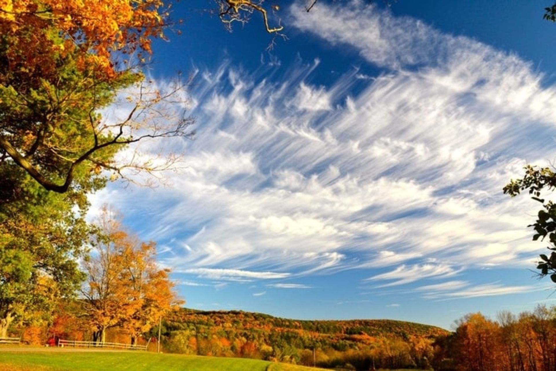 عکاس در اینجا به خوبی هم شاخ و برگهای پاییزی و هم هر پنج گونهی ابر سیروس را در تصویر ثبت کرده است. همهی ابرهای سیروس، باریک هستند. بیشتر ابرهایی که اینجا میبینید، به خصوص در وسط تصویر، ابرهای سیروس آنسینوس هستند. در سمت راست، پایین، جایی که ابرها بلندتر و مستقیمتر هستند، نوع فیبراتوس را میبینید. ابرهای پفداری که دقیقا بالای خط درختان در مرکز تصویر قرار گرفتهاند، کستلانوس نامیده میشوند. ابرهای باریک دیگر که در سراسر این ابرها پراکنده شدهاند، فلاکوس و اسپیساتوس هستند.