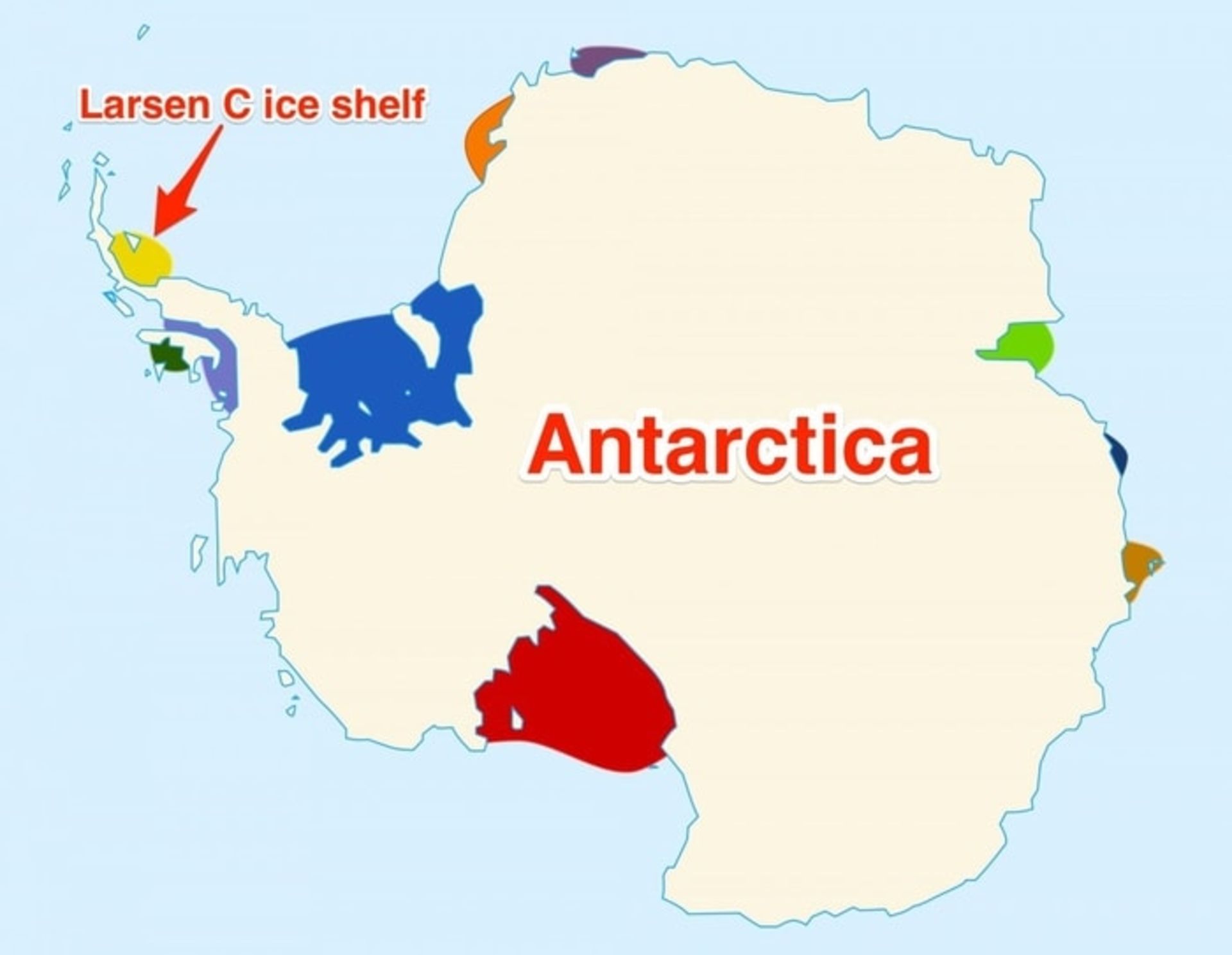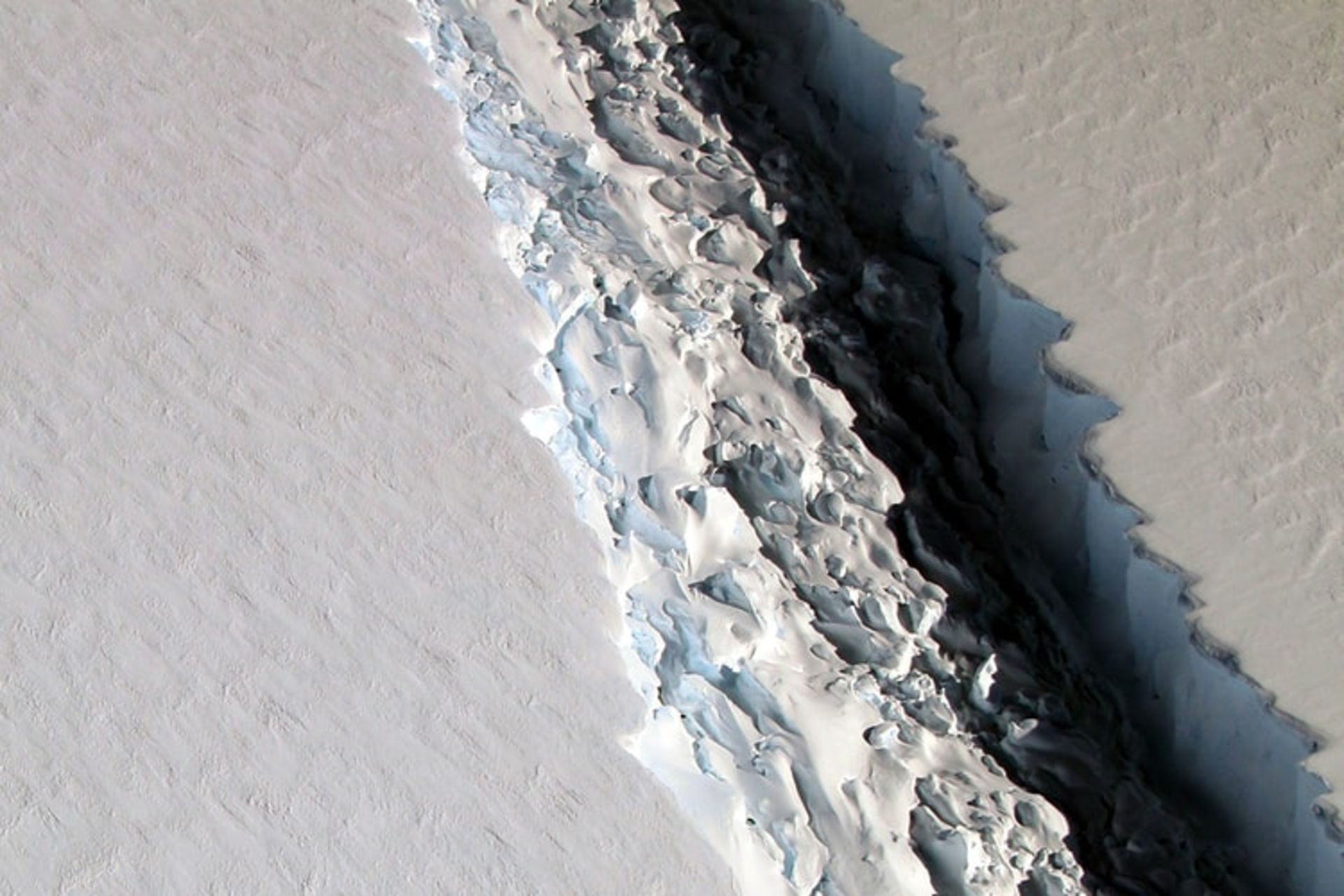 شکافی که در یخچال لارسن سی قطب جنوب به وجود آمده است، مساحتی بهاندازهی ایالت دلاور در آمریکا و حجمی برابر دریاچهی میشیگان دارد. این شکاف باعث شده است تا این کوه یخی جدا شود.