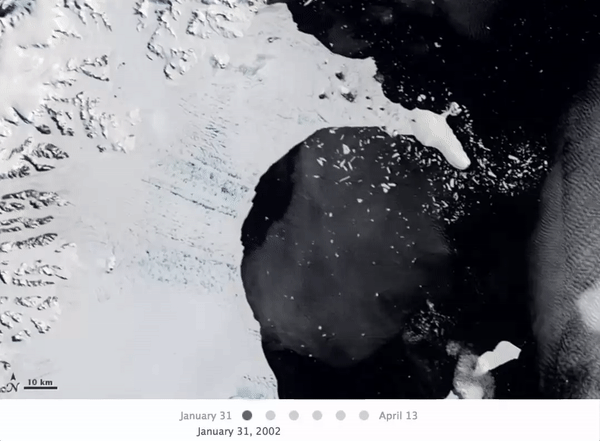 یکی از ماهوارههای ناسا به نام MODIS که تغییرات زمین را رصد میکند، جزو نخستین ماهوارههایی است که جدا شدن این کوه یخی عظیم از قطب جنوب را ثبت کرده است.