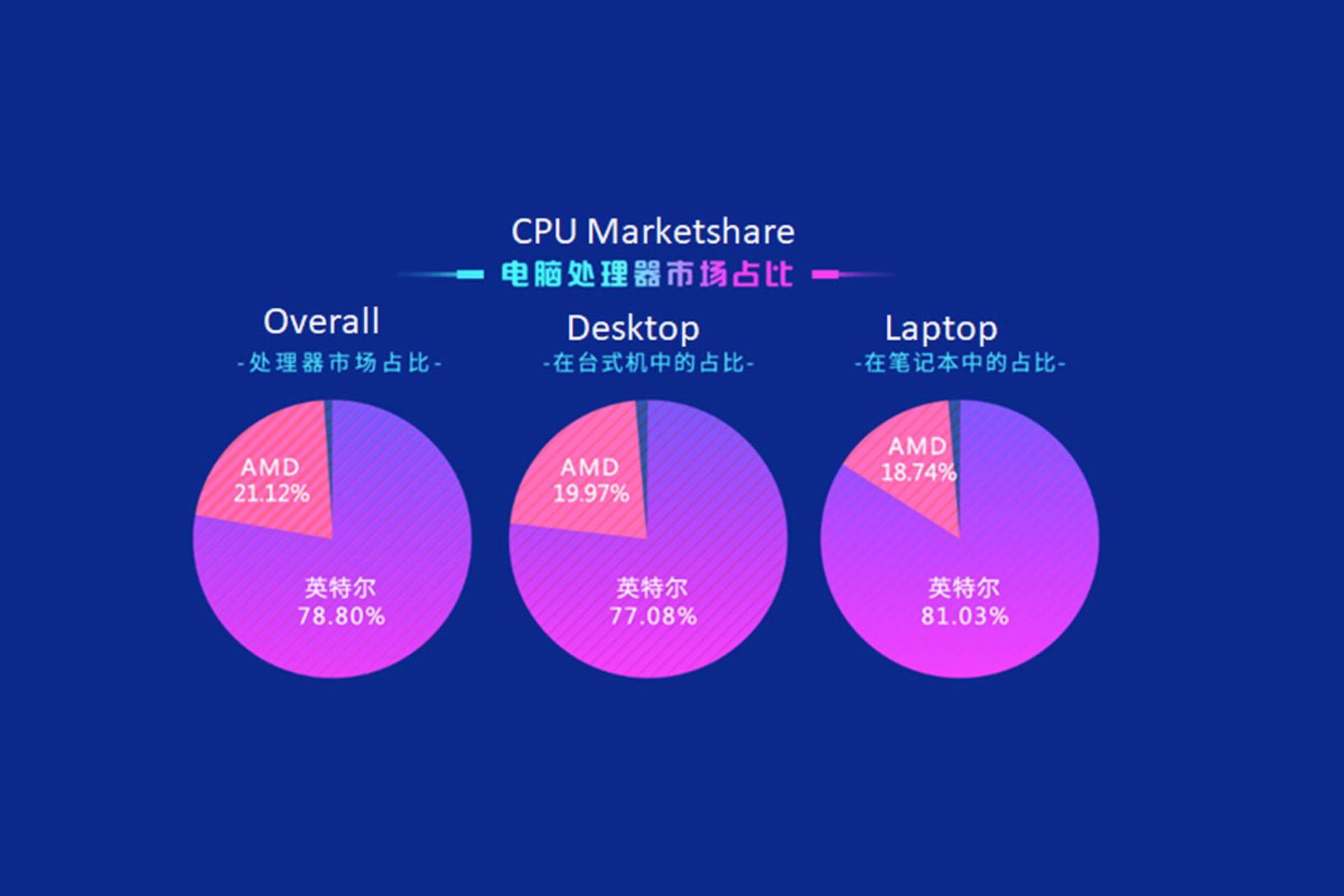 در بخش اطلاعات بازار پردازندههای مرکزی ادعا میشود که اینتل ۷۷/۰۸ درصد از بازار دسکتاپ و ۸۱/۰۳ درصد از بازار لپتاپ را در اختیار دارد. بهطور مجموع، ۷۸/۸ درصد از سهم بازار پردازندهی مرکزی در اختیار تیم آبی قرار دارد. درمقابل، سهم بازار AMD در فصل اول سال ۲۰۲۰، به ۲۱/۱۲ درصد رسیده است. اطلاعات منتشرشده، دیدگاه مناسبی نسبت به وضعیت سه شرکت بزرگ دنیای پردازنده در چین نشان میدهد. از اطلاعات دیگر میتوان به سهم ۳۲/۷۳ درصدی AMD درمقابل سهم ۶۸/۱۸ درصدی انویدیا در بازار پردازندههای گرافیکی اشاره کرد.
