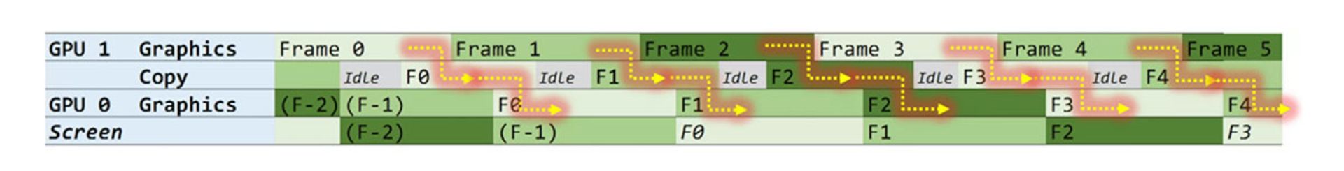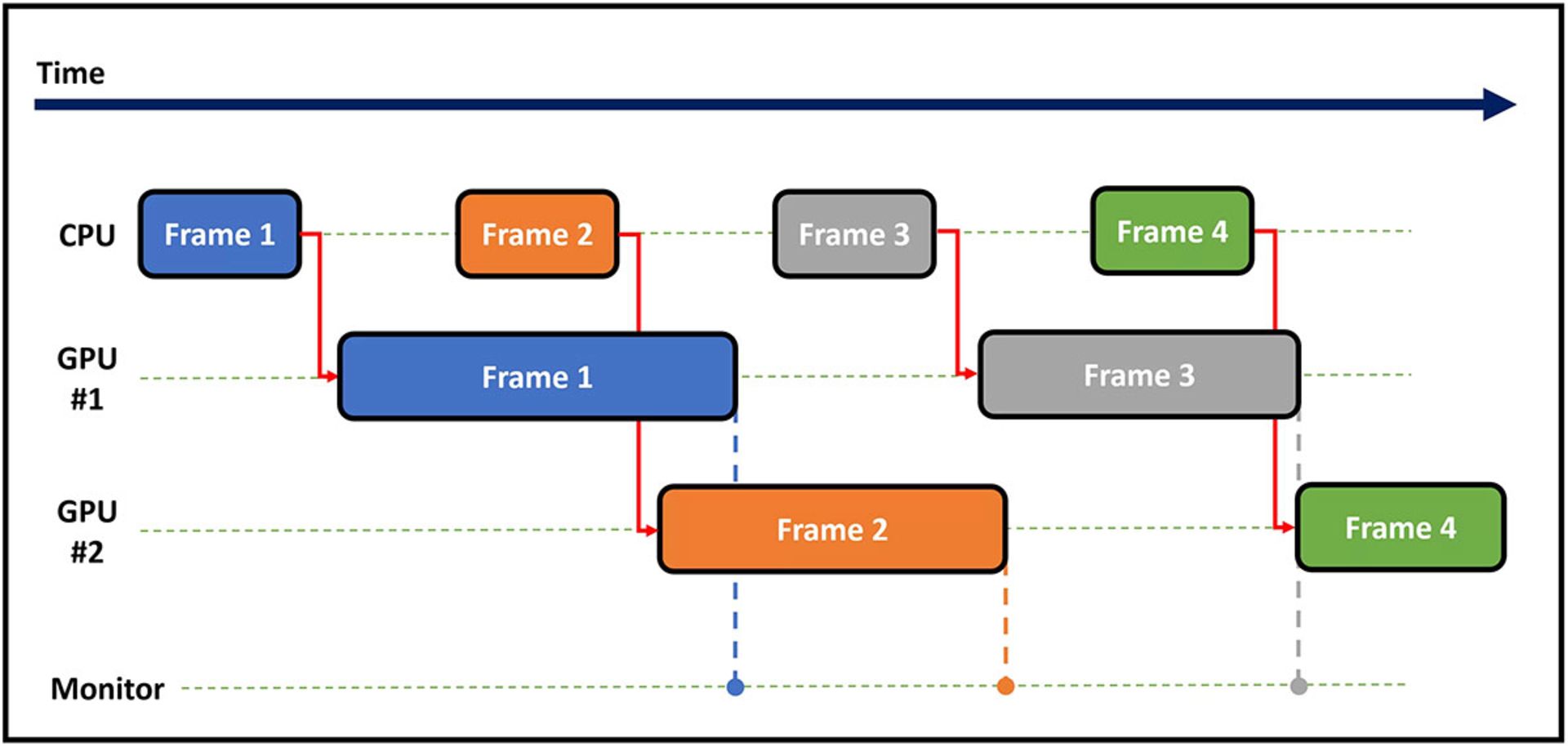 دیاگرام بالا چگونگی اجرای ساختار AFR را نشان میدهد. همانطورکه میبینید، فاصلهی زمانی بین نمایش فریمها روی نمایشگر درمقایسهبا حالت استفاده از پردازندهی گرافیکی واحد کمتر شده است. نرخ فریم کلی نیز بهتر میشود؛ هرچند هنوزهم در سطحی پایینتر از CPU قرار دارد.