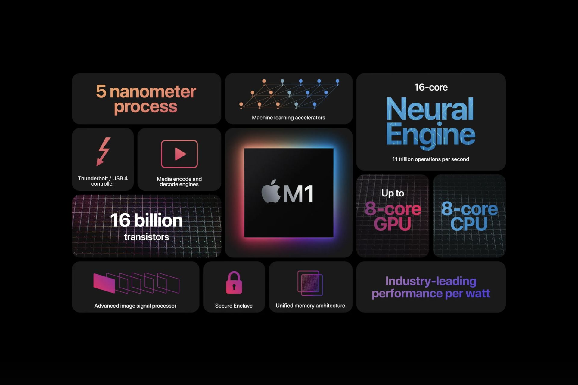 آنطور که اپل در جریان برگزاری رویداد One More Thing اعلام کرد، M1 یک سیستم-روی-چیپ (SoC) اختصاصی است و این یعنی واحدهای پردازشی مختلف نظیر پردازندهی مرکزی (CPU)، پردازندهی گرافیکی (GPU)، حافظهی رم را روی تراشهای واحد جای داده است؛ این سبک در طراحی تراشه را پیشتر در آیفون و آیپد مشاهده کرده بودیم. تمامی واحدهای پردازشی نامبرده توسط اپل طراحی شدهاند.