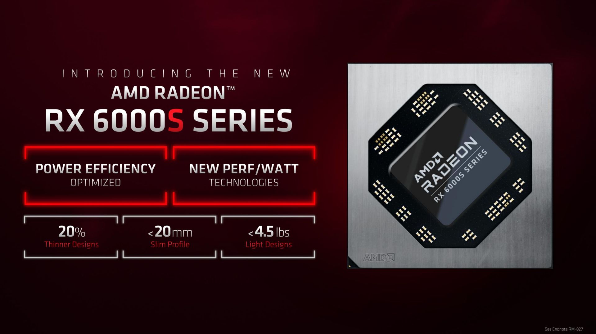 AMD همچنین خانواده پردازندههای گرافیکی Radeon RX 6000S را نیز رونمایی کرده است که براساس فرایند ۶ نانومتری TSMC ساخته و برای بهرهوری بسیار بالا بهینهسازی شدهاند تا بتوان از تراشهها در طراحیهای نوتبوکهایی تا ۲۰ درصد باریکتر از گذشته استفاده کرد. اسکات هرکلمن، رئیس بخش رادئون میگوید که تراشههای 6000S در لپتاپهایی که کمتر از ۲۰ میلیمتر یا تقریباً سه چهارم اینچ ضخامت دارند، تعبیه خواهد شد.