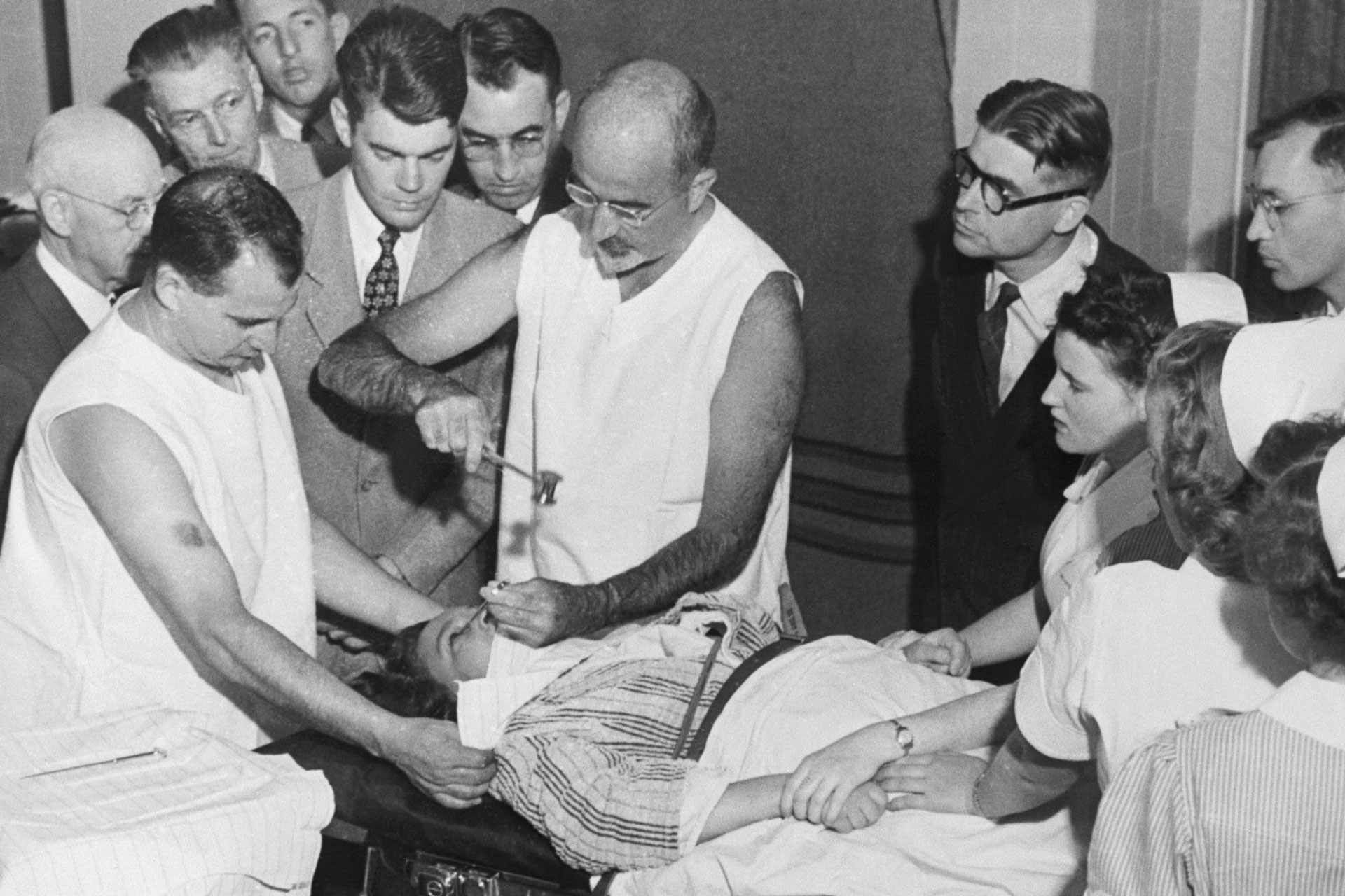 بیماری که کف آسایشگاه روانی کلیولند، اوهایو دراز کشیده است. عکس مربوط به سال ۱۹۴۶