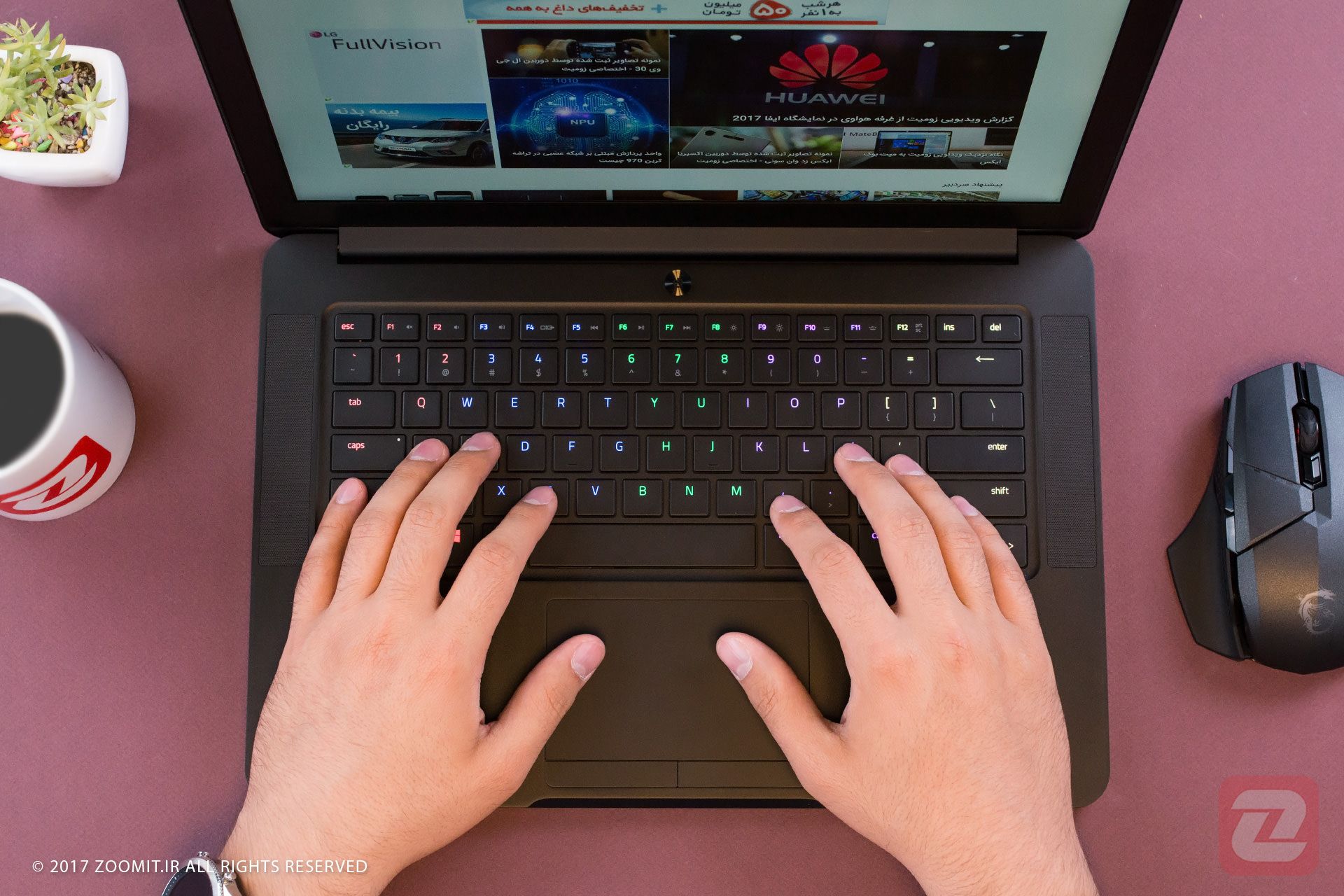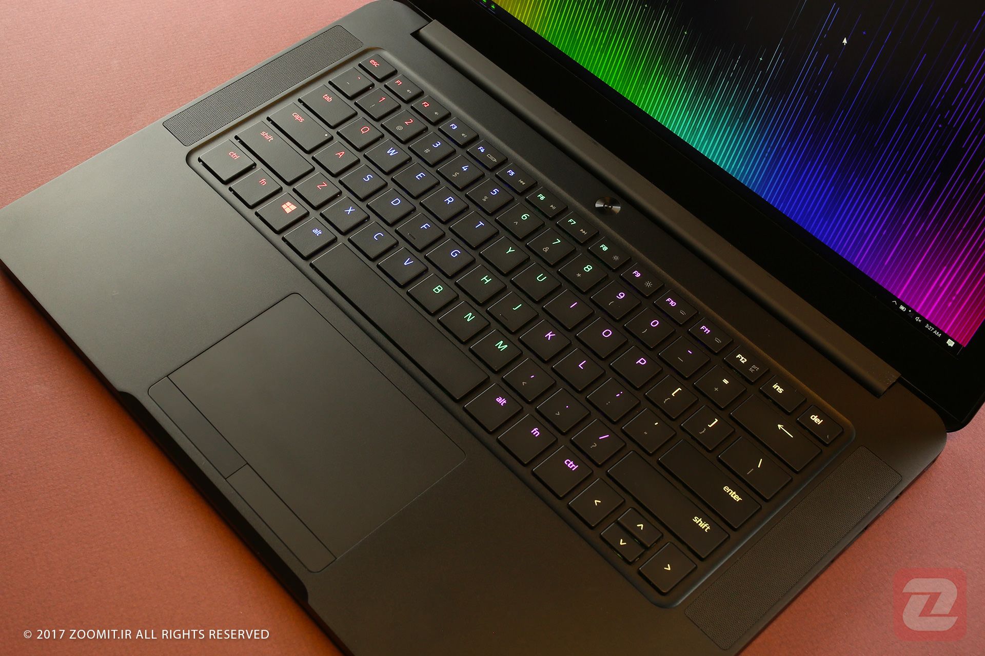ریزر برای بلید ۲۰۱۷ از کیبوردی با چینش جزیرهای (Chicklet) استفاده کرده است؛ یعنی کلیدها بهصورت جدا و با فاصله از هم قرار گرفتهاند. بهجز کلیدهای چهار جهت اصلی که بهصورت فشرده طراحی شدهاند، باقی کلیدها ابعاد بزرگ و مناسبی دارند و فاصلهی بین آنها هم مناسب ارزیابی میشود. البته در نظر داشته باشید که کیبورد بلید، بخش ماشین حساب یا Numpad ندارد؛ این موضوع به ریزر کمک کرده است تا کیبوردی با کلیدهای بزرگ برای لپتاپ ۱۴ اینچی خود در نظر بگیرد و در ضمن، بلندگوهای لپتاپ را هم به دو طرف کیبورد انتقال دهد. مثل فضای اطراف کیبورد، کلیدها هم روکشی مات دارند که از سُر خوردن انگشتان دست، جلوگیری میکند. این موضوع درکنار ابعاد بزرگ و فاصلهی مناسب بین کلیدها، به شما کمک خواهد کرد تا بتوانید با سرعت زیاد و با حداقل اشتباه تایپ کنید؛ بهعلاوه با وجود بدنهی باریک، فضای کافی برای حرکت کلیدها وجود دارد و فشردن آنها، بازخورد خوب و صدای «کلیک» دلنشینی ارائه میدهد؛ البته از شرکتی که بهطور تخصصی به طراحی کیبوردهای کامپیوتری مشغول است، انتظاری کمتر از این نداشتیم؛ پس اگر با فرض محال، بخواهید از بلید ۲۰۱۷ برای کار دیگری بهجز بازی کردن استفاده کنید، مشکلی از بابت سرعت و دقت تایپ کردن نخواهید داشت. خبر خوب برای علاقهمندان به بازی اینکه کیبورد بلید ۲۰۱۷ از فناوری ضد-سایهاندازی (Anti-Ghosting) هم پشتیبانی میکند. این فناوری تضمین میکند در بازیهایی که نیاز دارید چندین کلید را بهصورت همزمان فشار دهید، تمام فرامین و کلیدها به دقت شناسایی شوند. این فناوری بیشتر در بازیهای سبک MMORPG و استراتژیک کاربرد دارد.