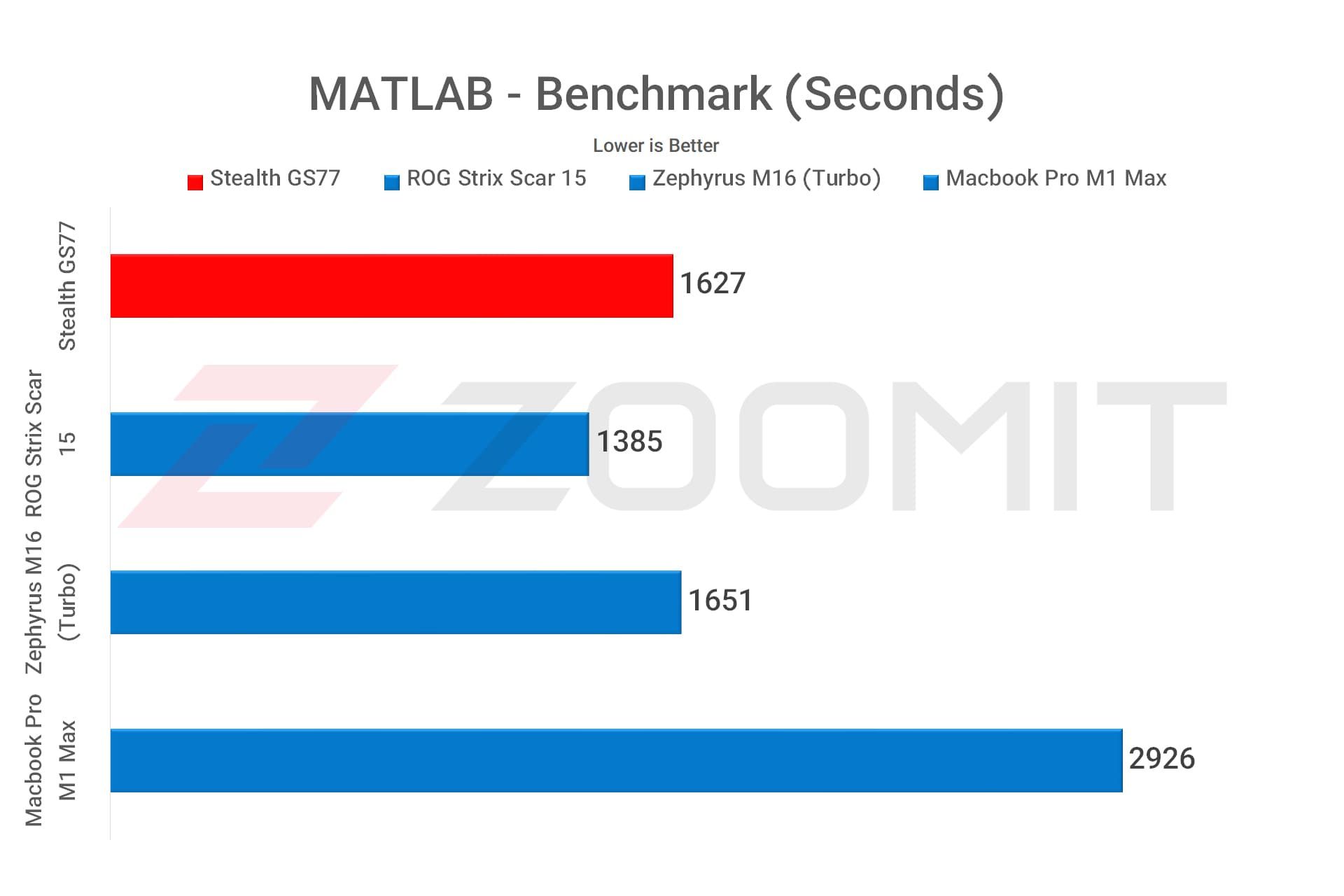لپتاپ Stealth GS77 اماسآی هزار دور از بنچمارک متلب را در طول مدت ۱۶۲۷ ثانیه بهسرانجام میرساند؛ ایندرحالیاست که مکبوک پرو ۱۶ اینچی اپل با تراشه M1 Max آزمون مشابه را در ۲۹۲۶ ثانیه انجام میدهد. بااینحال همچنان لپتاپ Scar 15 ایسوس بهواسطه بهرهمندی از توان مصرفی بالاتر تراشه، قویتر از دیگر نمایندهها ظاهر میشود.