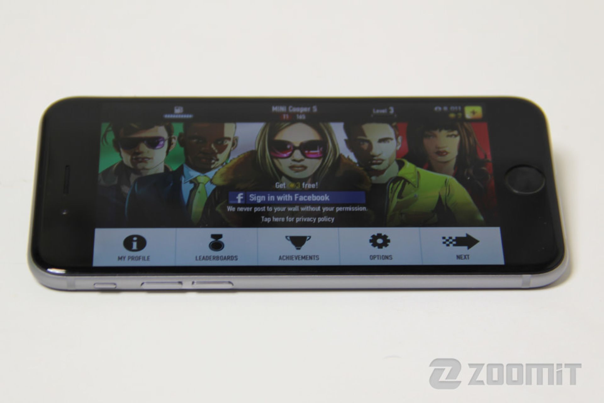 این صفحهنمایش از هر نظر فوقالعاده است، شدت روشنایی آن بسیار خوب است و بهراحتی میتوان زیر نور آفتاب از آن استفاده کرد، حداقل روشنایی صفحه هم آنقدر مناسب است که بتوان از آن در شب برای مرور اخبار روز استفاده کرد. در صفحهنمایش آیفون ۶ از شیشهی گوریلا گلس 2.5D استفاده شده که لبههای آن انحنای خاصی دارد که علاوه بر بهبود جلوهی ظاهری دستگاه، حس به مراتب بهتری را نسبت به صفحههای مسطح القاء میکند.
