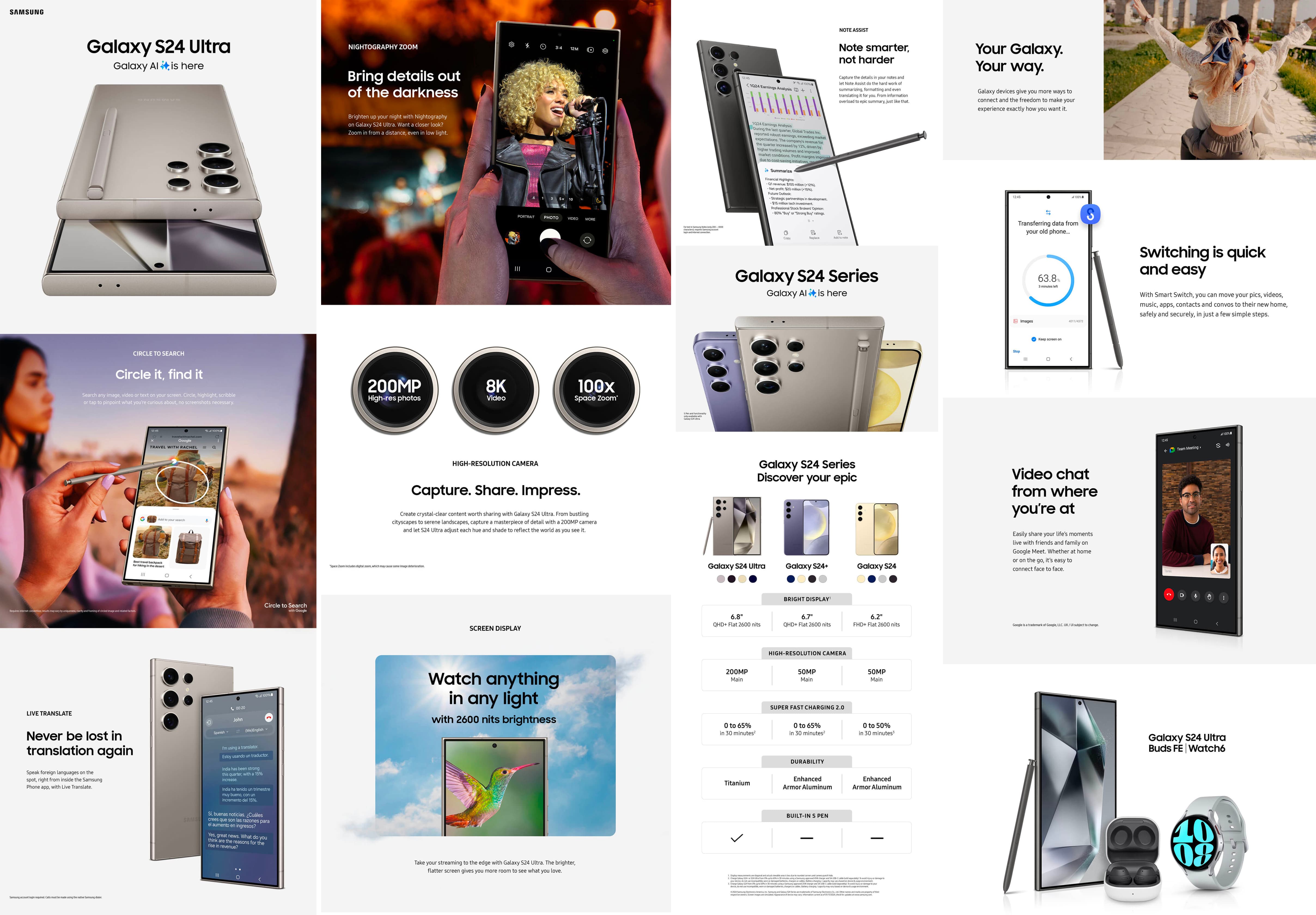 پوسترهای جدید دوربین اصلی ۲۰۰ مگاپیکسلی در گلکسی اس ۲۴ اولترا و دوربین اصلی ۵۰ مگاپیکسلی در گلکسی اس ۲۴ و گلکسی اس ۲۴ پلاس را تأیید میکنند. هر سه گوشی قابلیت فیلمبرداری 8K دارند.