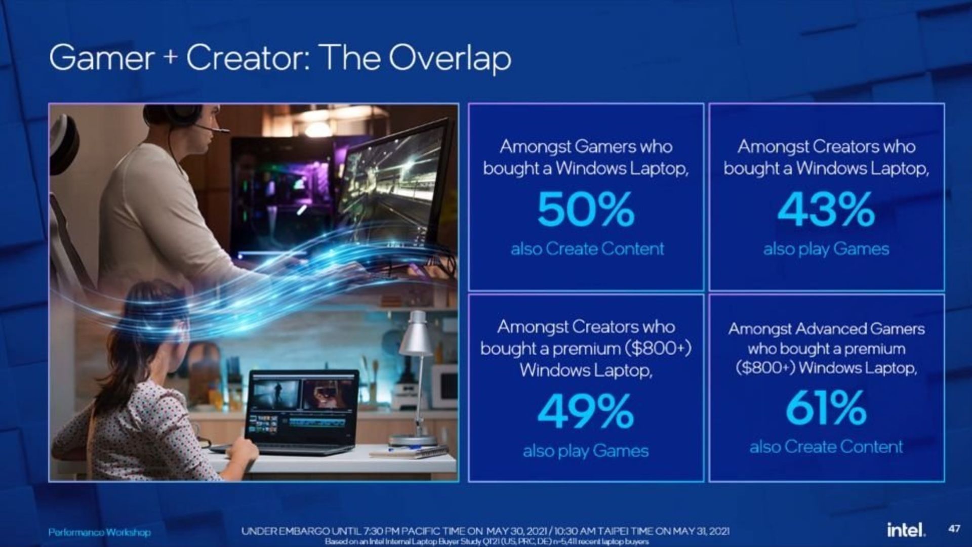 تیم آبی همچنین گریزی به آمار و ارقام تولید محتوا در کامپیوترهای ویندوزی توسط گیمرها انداخته است. بر اساس آمار، بالغ بر ۵۰ درصد از خریداران نوتبوک ویندوزی محتوا ایجاد میکنند و ۴۳ درصد از سازندگان محتوا برای انجام بازیها همین رویه را دارند. تقریبا ۴۹ درصد از سازندگان محتوا، یک نوتبوک ویندوز به ارزش ۸۰۰ دلار یا بیشتر خریداری میکنند. سهم گیمرهای حرفهای که نوتبوک ویندوزی خریداری کردهاند، در تولید محتوا به ۶۱ درصد میرسد.