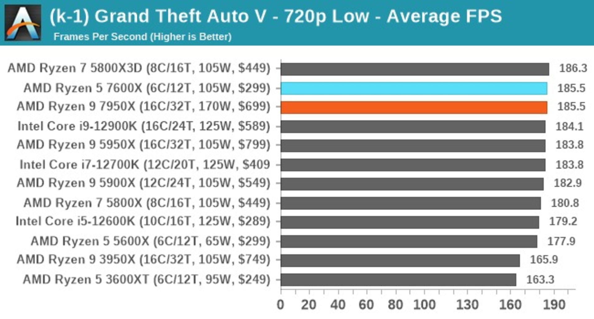 آنچه در عملکرد گیمینگ دو پردازنده دیده شد به اندازهی عملکرد پردازشی آنها چشمگیر نبود و به نظر میرسد که پردازندههایی مانند Core i9-12900K با جدیدترین پردازندههای AMD قابل رقابت هستند. نتایج نشان میدهند که در بازی World of Tanks با گرافیک GeForce RTX 2080 Ti انویدیا، Ryzen 5 7600X بالاترین امتیاز را در رزولوشن 1080p با نرخ فریم میانگین کسب کرده است؛ بنابراین هستههای Zen 4 در گیمینگ با رزولوشن بالا (که بیشتر فشار کاری روی پردازندهی گرافیکی است) عملکرد قدرتمندی دارند.در رزولوشن 720p و پایینتر با همان نرخ فریم متوسط، چنین نتایج درخشانی بهدست نمیآیند و پردازندههای جدید AMD در بازی Grand Theft Auto V، با وجود پیشی گرفتن از Core i9-12900K، جایگاه اول را به Ryzen 7 5800X3D واگذار میکنند.