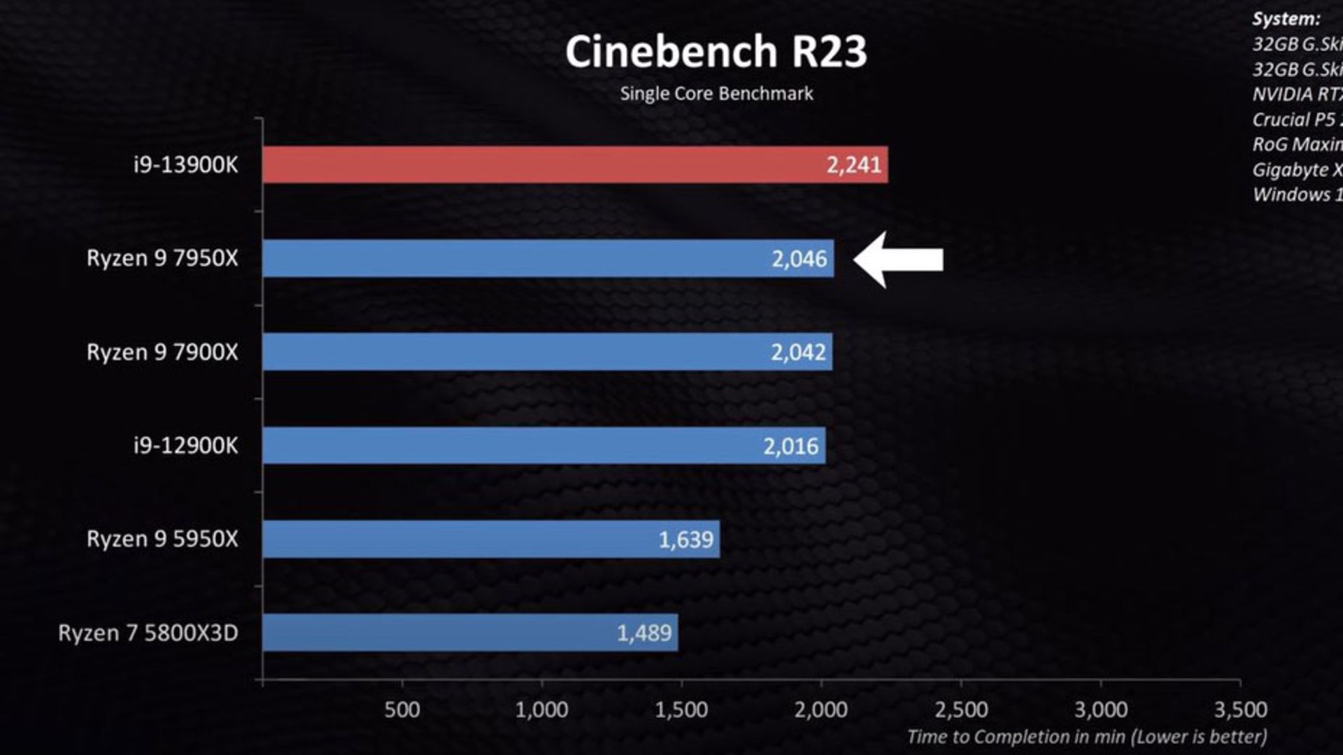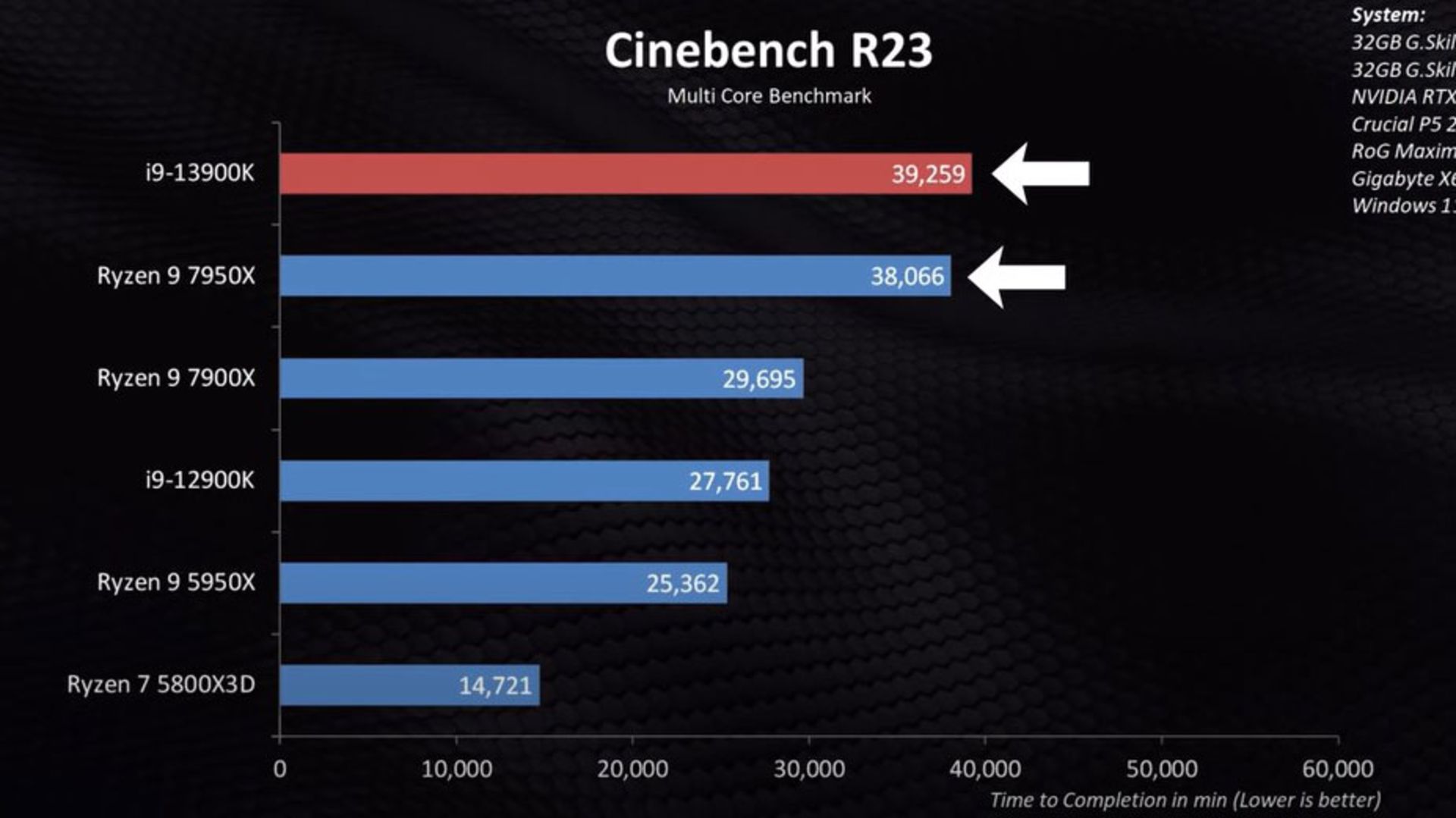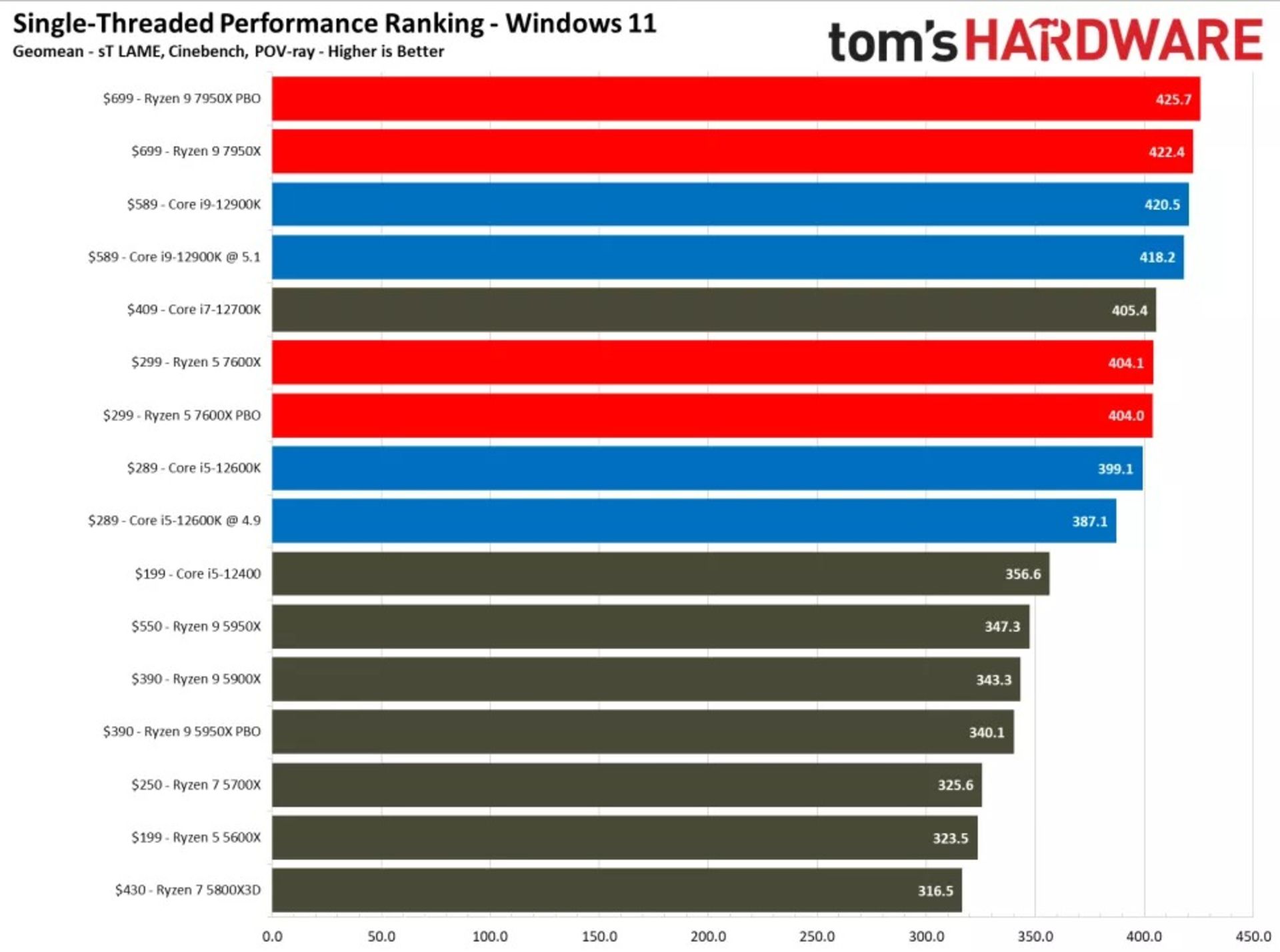 عملکرد تکهستهای در پردازندهای سری 7000 رایزن AMD بهتر از اینتل است و i9-13900K برای شکست قاطعانهی 7950X به توان مصرفی بیشتری نیاز دارد.