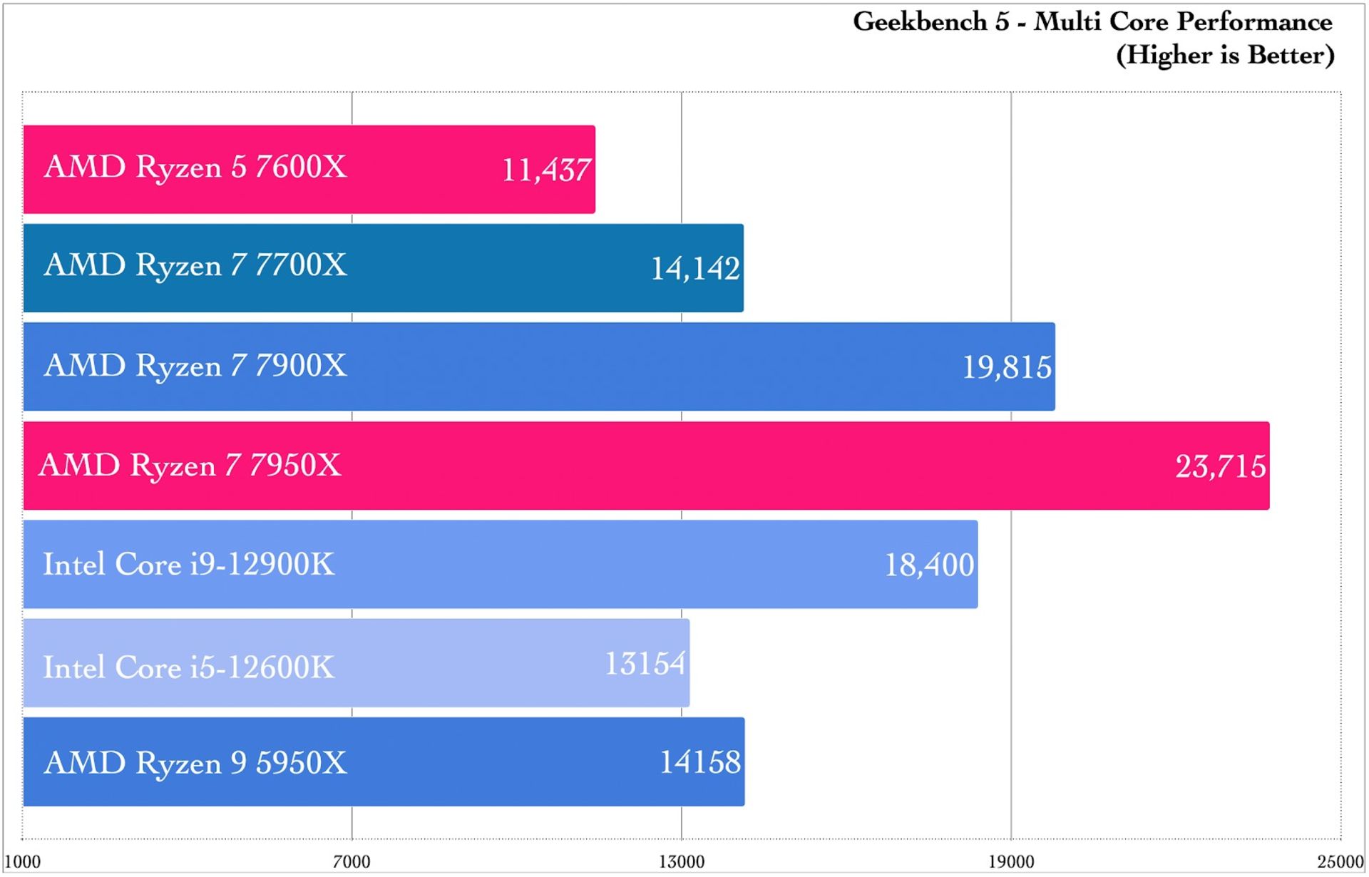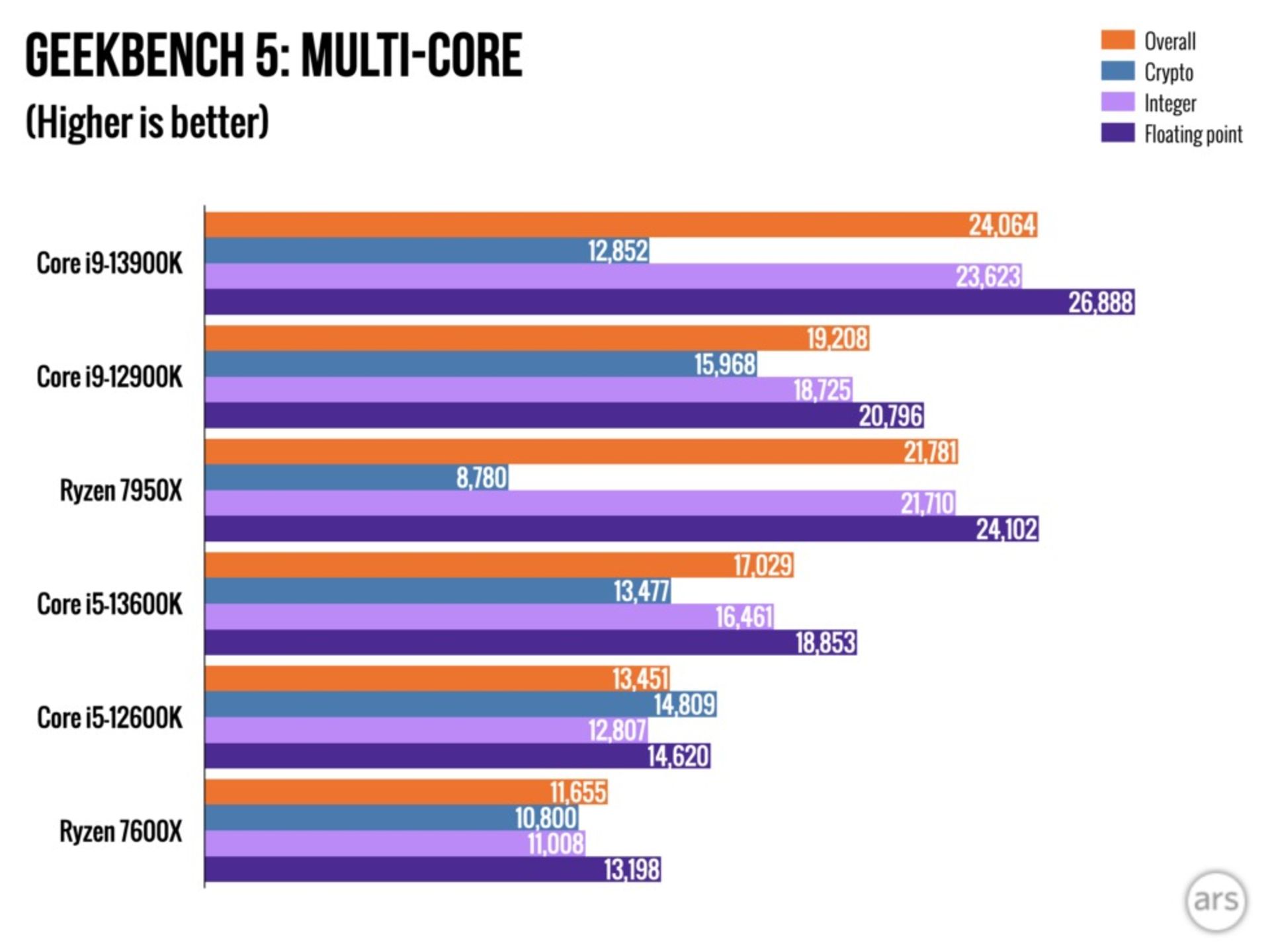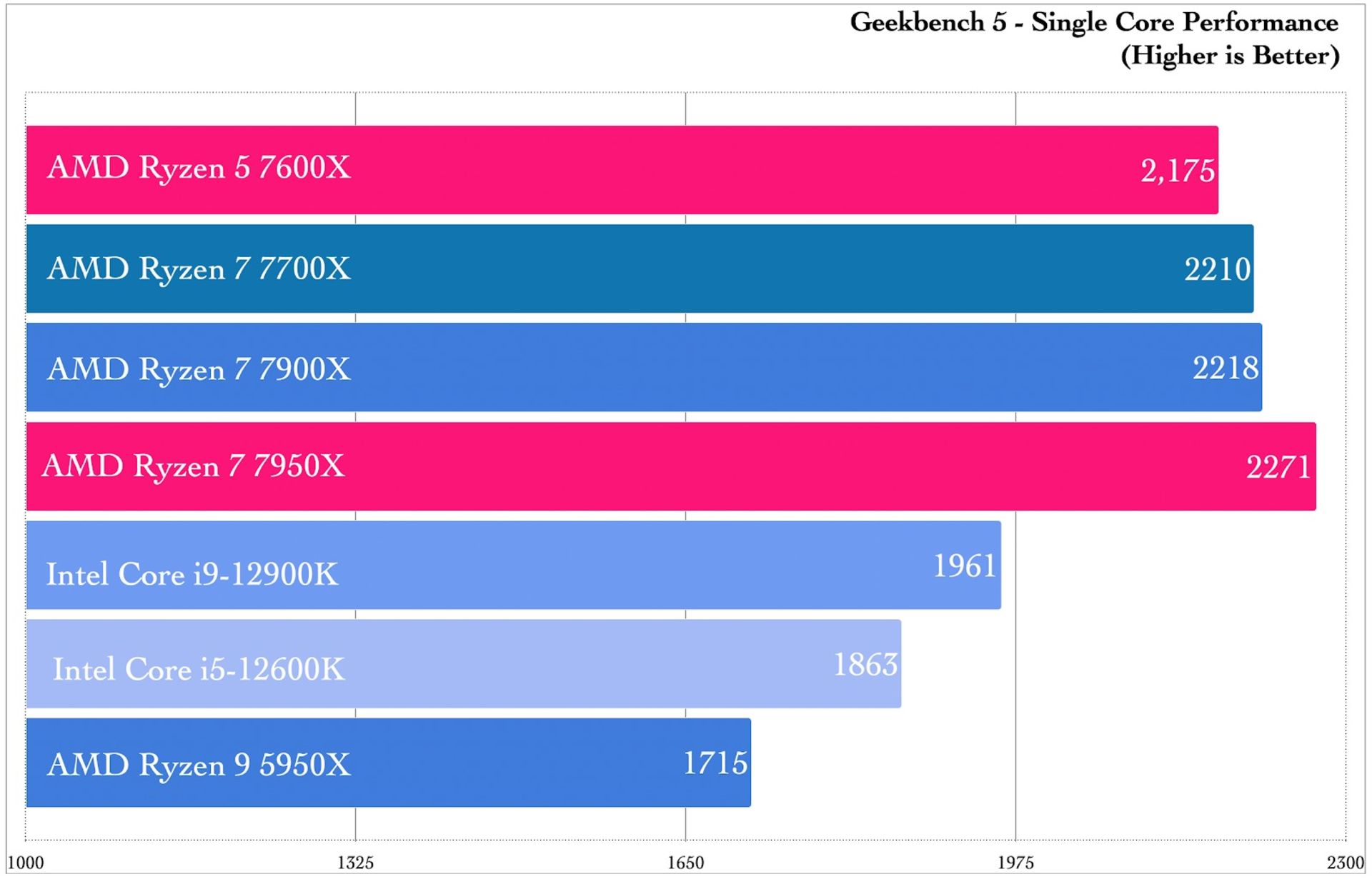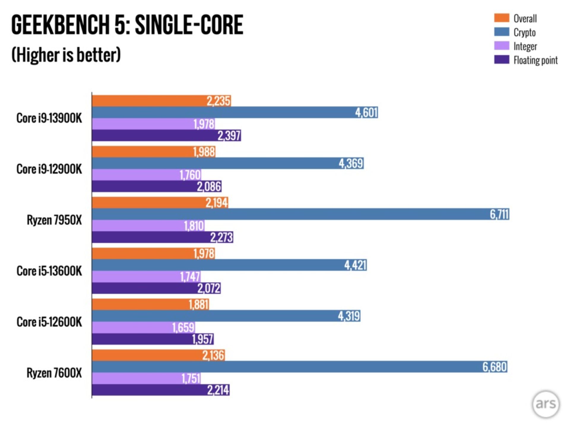 از دید ArsTechnica پردازندهی پرچمدار سری 7000 رایزن، یعنی Ryzen 9 7950X، در تست تکهستهای GeekBench تقریباً ۱۱ درصد از Core i9-12900 اینتل سریعتر و حدود ۴ درصد هم در بنچمارک Cinebench سریعتر است؛ البته مقایسهی این پردازنده با مدل پرچمدار نسل سیزدهم اینتل که بهتازگی معرفی شدهاند، نشان میدهد که Ryzen 9 7950X حدود ۲ درصد از Core i9-13900K ضعیفتر عمل میکند، بااینحال Ryzen 5 7600X از مدل پایهی تراشهی نسل سیزدهم اینتل یعنی Core i5-13600K حدود ۸ درصد بهتر عمل میکند.