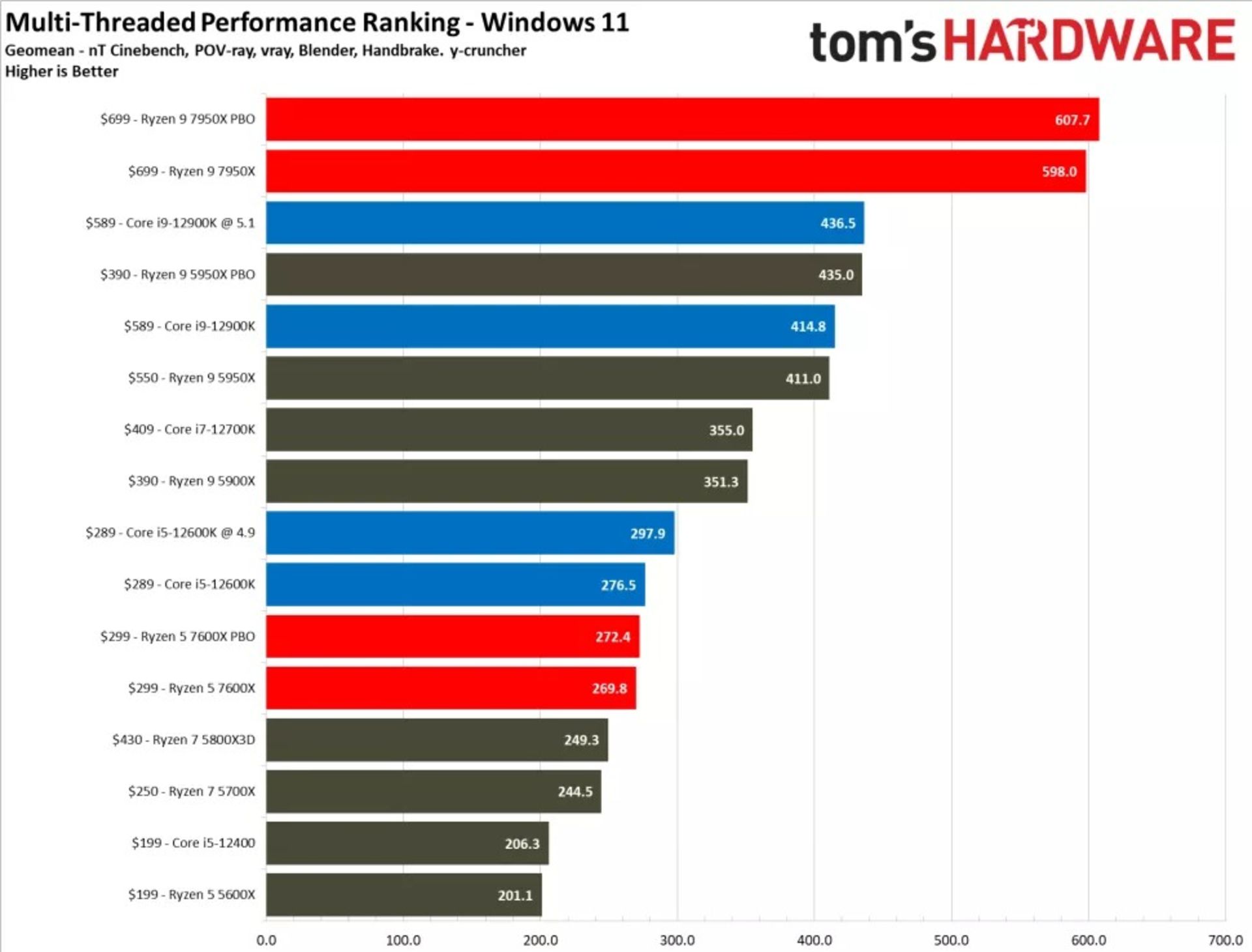 در تست چندهستهای هم Ryzen 9 7950X از همردهی نسل دوازدهم اینتلی خود با اختلاف قویتر است، اما از تراشهی پرچمدار نسل سیزدهم اینتل، حدود ۱۰ درصد ضعیفتر عمل میکند.Ryzen 7600X هم در مقایسه با Core i5-13600K در تست چندهستهای عملکرد با اختلاف کندتر است.