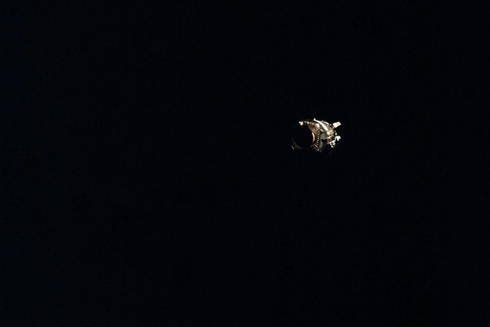 چپ: فضاپیما به دور ماه چرخید تا با کمک گرانشی آن به زمین بازگردد. اگر انفجار در نقطهای متفاوت از مأموریت رخ میداد، فضانوردان ممکن بود قادر به بازگشت به خانه نباشند. راست: نمایی تاریک از کابین ماژول ماهنشین با چند چراغ هشدار قرمز.