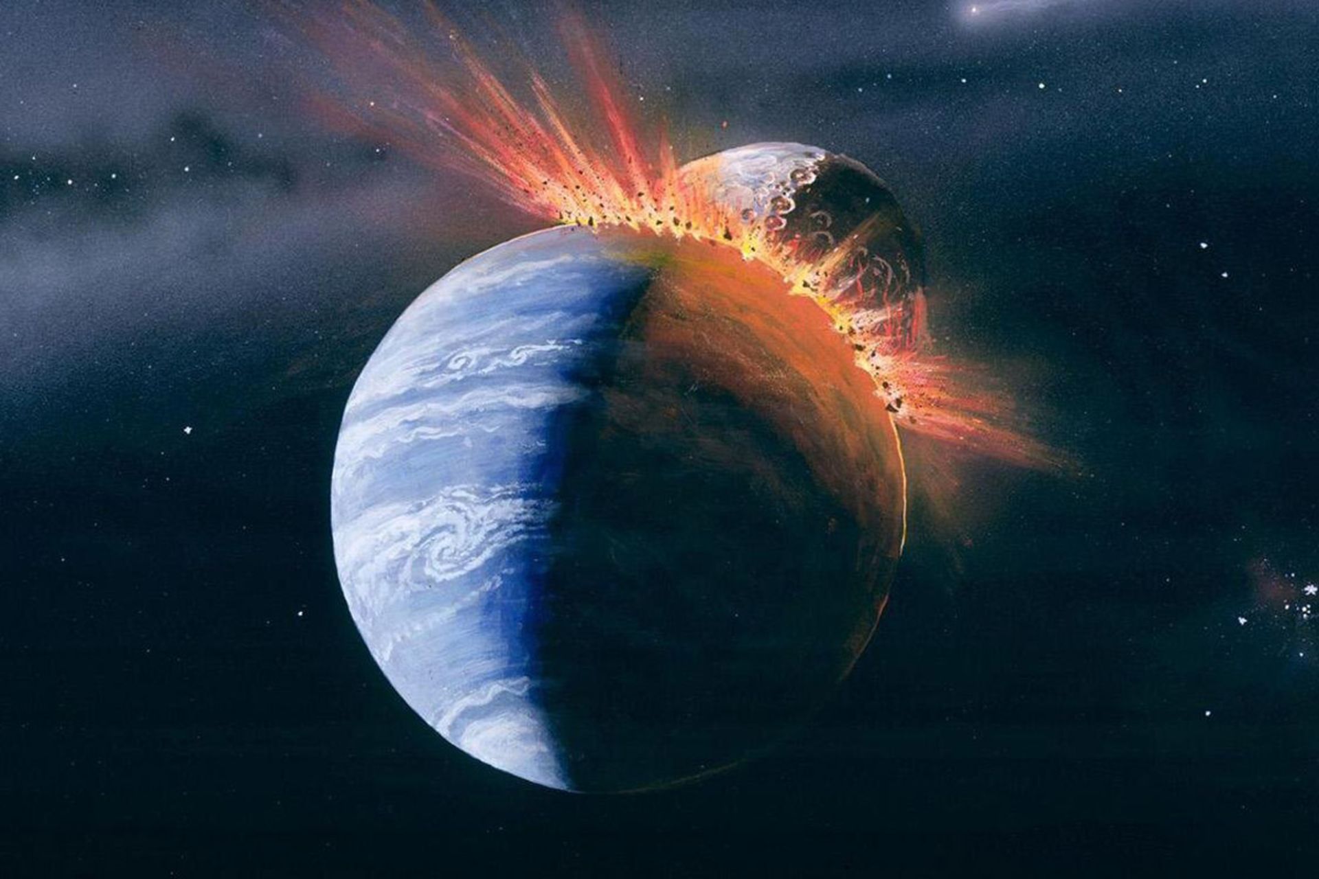 درعینحال خورشید که تا اندازهای سردتر از خورشید کنونی بود، سالهای نوزادی خود را پشت سر میگذاشت و زبانههای خشمگین و قدرتمند و بادهای خورشیدی شدید را به فضا میفرستاد. عجیب است که جو زمین تحت چنین شرایطی باقی ماند و به سیارهی سکونتپذیر کنونی تبدیل شد. شاید بهتر است از تیا تشکر کنیم. بخشی از تودههای جداشده از زمین، ماه را تشکیل دادند. طبق پژوهشی جدید، میدان مغناطیسی ماه در آن زمان مانند سپری از زمین در برابر خشم سوزان خورشید محافظت کرده است. بهگفتهیجیم گرین، فیزیکدان و دانشمند ارشد ناسا و یکی از پژوهشگران بررسی جدید: