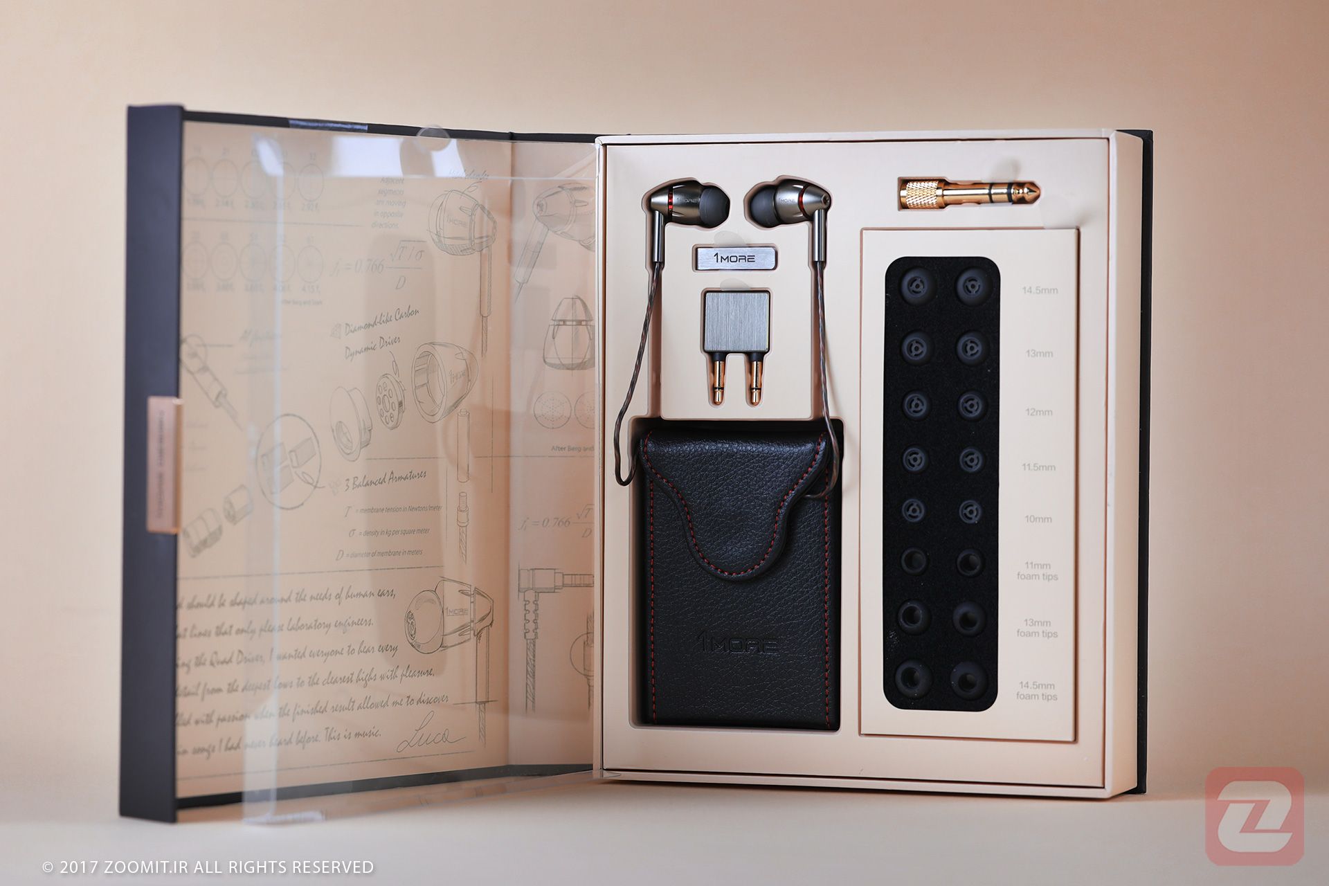 در سالهای اخیر، بسیاری از تولید کنندگان هدفون، با قرار دادن وسایل جانبی مختلفی از جمله کیف قابل حمل و چند سایز Ear Bud مختلف، بسته کاملی را برای خریداران تهیه میکنند؛ اما 1More محتویات درون جعبه را به سطح دیگری برده است و انواع و اقسام وسایل جانبی را درون جعبه هدفون Quad Driver قرار داده است تا به تمام نیازهای خریدار، پاسخ داده شود. از همان ابتدا که جعبه هدفون را باز میکنید، پی میبرید که با یک کالای لوکس و با کیفیت ساخت بالا مواجه هستید.