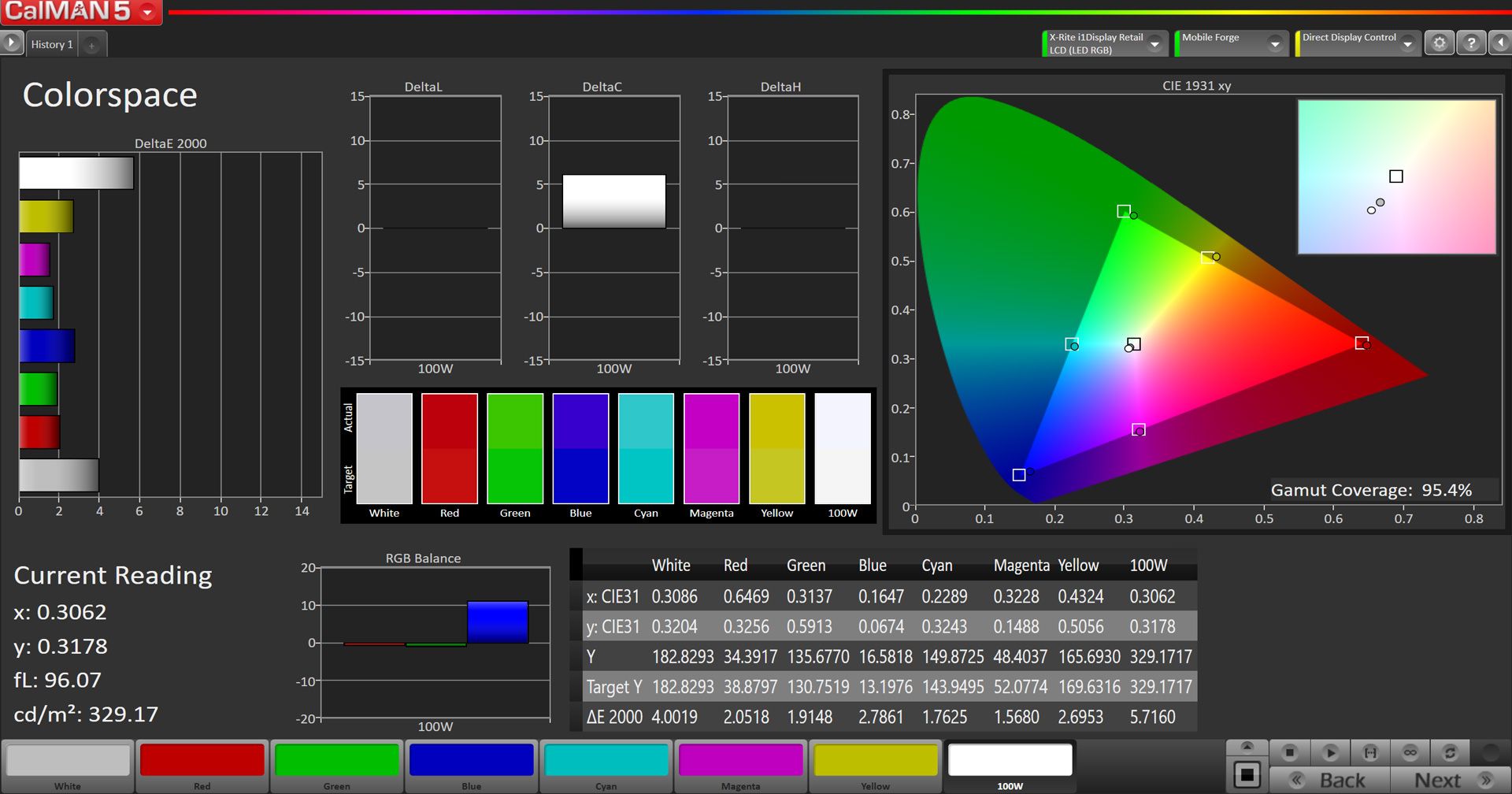 مدیاپد M5 پرو در آزمایش دقت رنگ ما موفق ظاهر شد؛ به طوری که در حالتهای رنگی متناسب با فضای رنگی آنها خطای ۳.۱ را ثبت کرد که عددی مناسب در دنیای تبلتها محسوب میشود. میانگین خطا در حالتهای دیگر نیز زیر ۵ است که نشان از عمکرد خوب هواوی در این بخش دارد. رنگ سفید در این تبلت در هر دو حالت رنگی کمی سردتر از سفید معیار نمایش داده میشود؛ البته کاربران به لطف اسلایدر دو بعدی دمای رنگ موجود در تنظیمات نمایشگر قادر به کالیبره کردن نمایشگر به صورت دستی نیز خواهند بود. در پایان این بخش باید گفت که نمایشگر ام ۵ پرو بهترین چیزی نیست که در تبلتهای بالارده دیدهایم اما تجربهای ارائه شده هنوز هم برای بسیاری از کاربران لذتبخش است.
