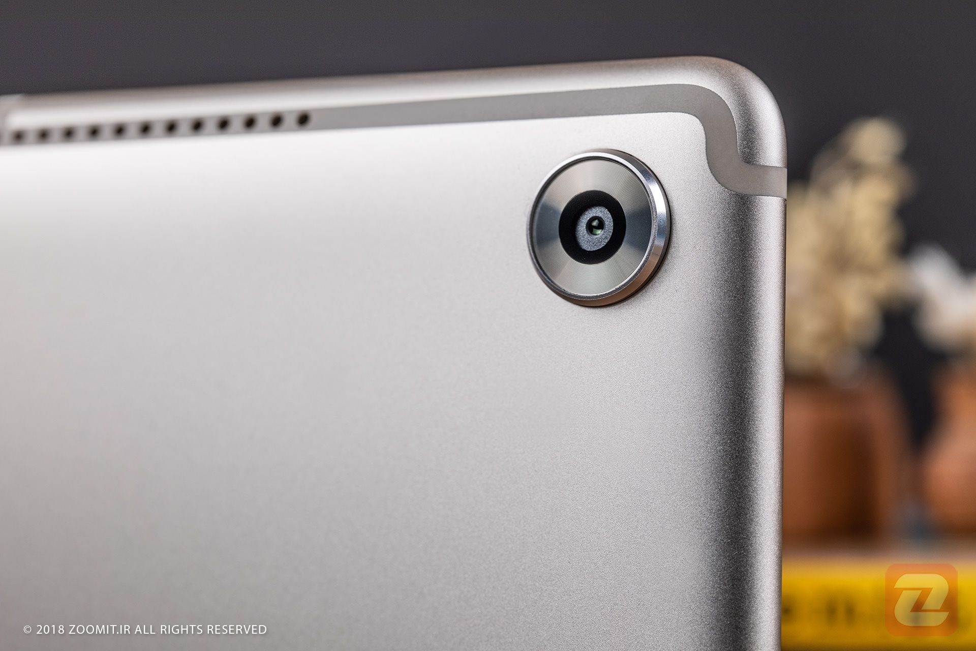 در پنل پشتی مدیاپد M5 Pro، آنچه بیش از همه خودنمایی میکند، برآمدگی دوربین در گوشهی سمت راست و بالای تبلت و ردیفی از روزنهها است که در لبهی بالا و پایین دستگاه ایجاد شدهاند و در پس خود از چهار اسپیکر میزبانی میکنند؛ البته در لبهی پایین مدیاپد M5 Pro سه پین مربوط به اتصال کیبورد فیزیکی نیز به چشم میخورند؛ خاطرنشان میکنیم که این کیبورد همراه تبلت ارائه نمیشود و زومیت نیز آن را برای بررسی در اختیار نداشت.