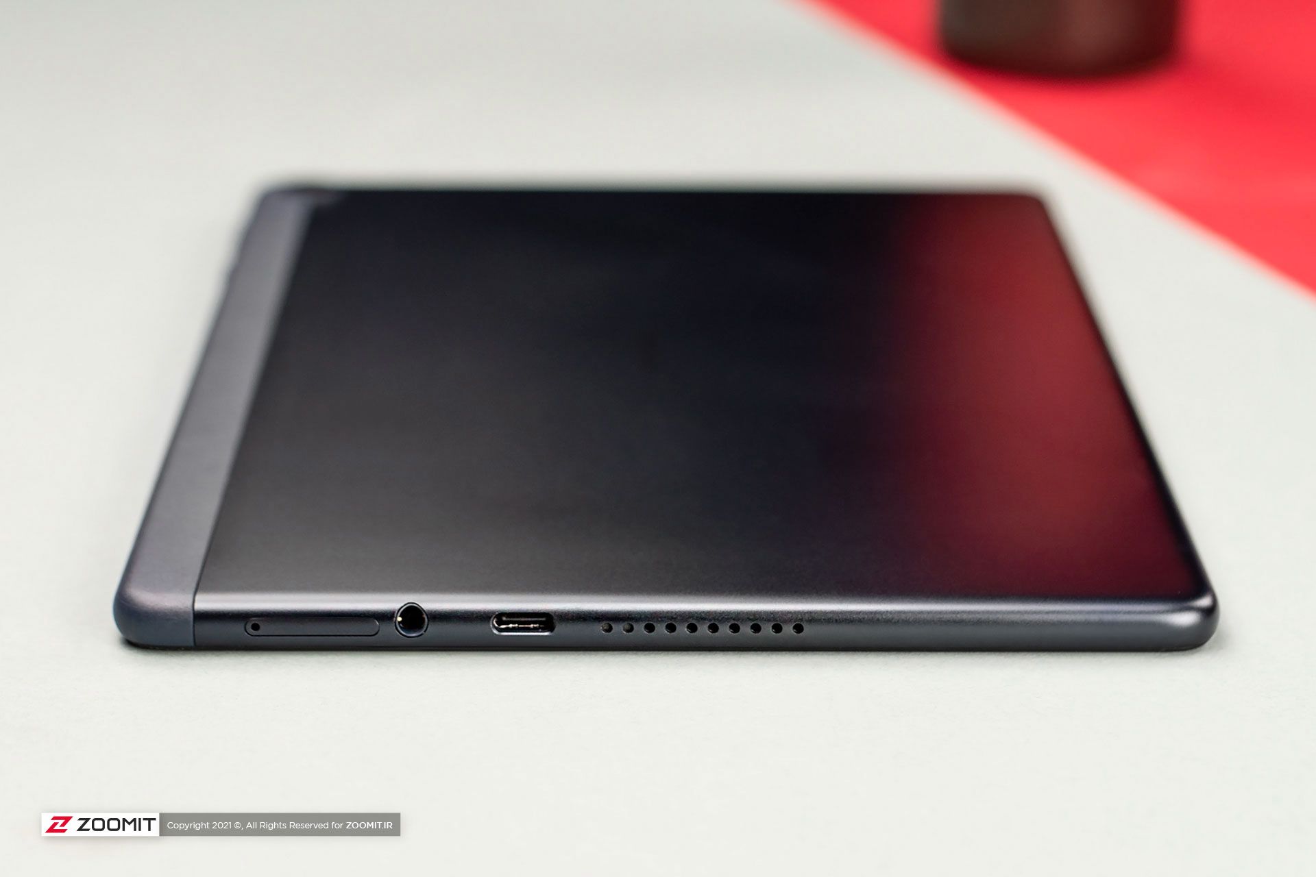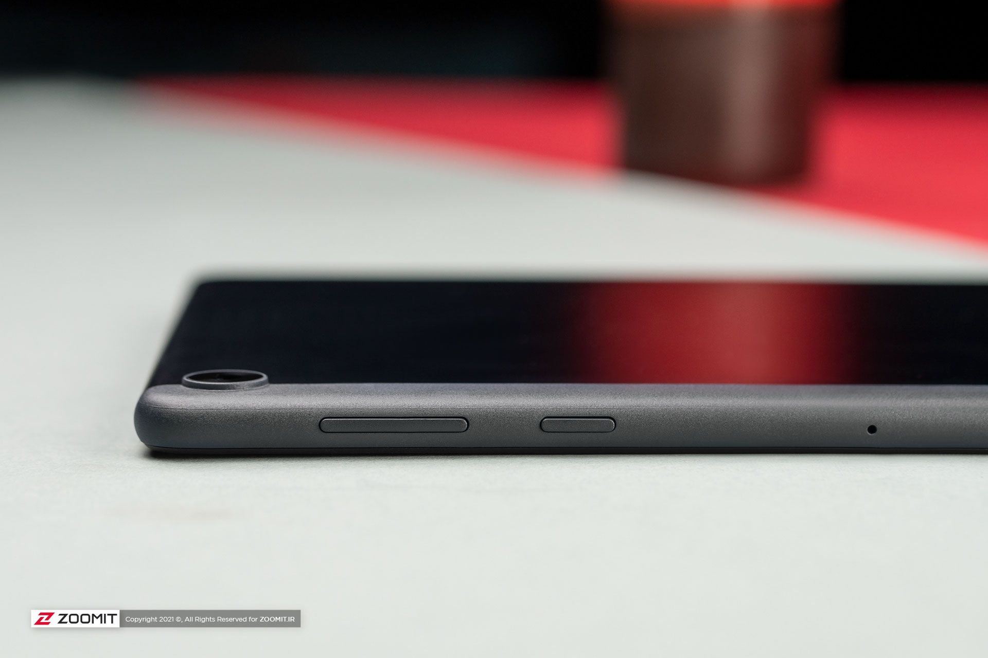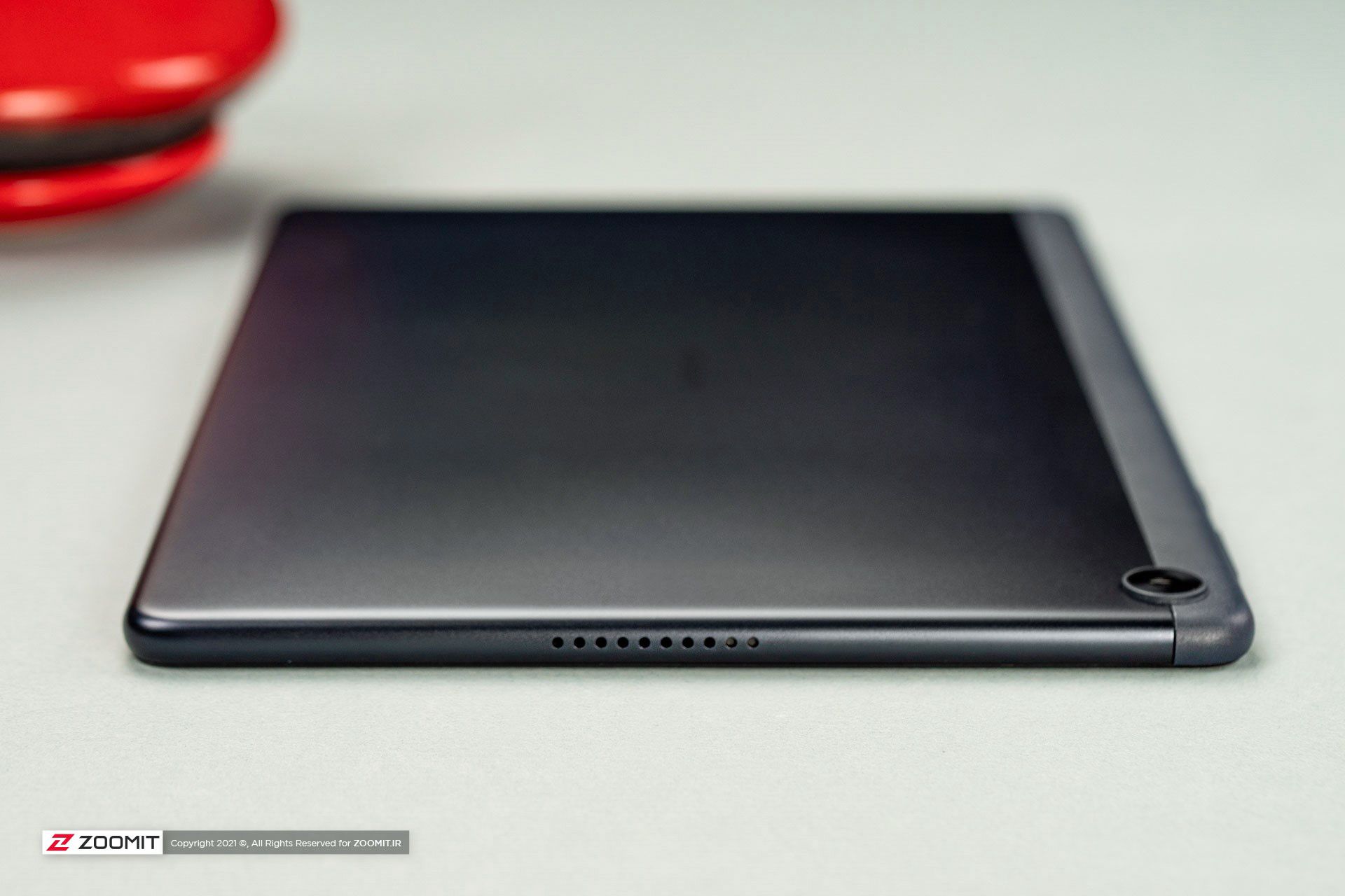 باتوجه به محل قرارگیری دوربین سلفی و نسبت تصویر ۱۶:۱۰ نمایشگر، بهتر است از میت پد تی ۱۰ در حالت افقی استفاده کنید. اگر میت پد تی ۱۰ را در حالت افقی بهدست بگیرید، روی لبهی بالا کلیدهای پاور و تنظیم صدا را مشاهده میکنید. در کنار این کلیدها دو میکروفن هم دیده میشوند. روی لبهی سمت راست، محل قرارگرفتن سیمکارت و کارت حافظه، جک ۳٫۵ میلیمتری خروجی صدا و بلندگو بهچشم میخورند؛ درحالیکه کانال دیگر اسپیکر در لبهی سمت چپ قرار دارد. لبهی پایینی دستگاه از هیچگونه پورت یا درگاهی میزبانی نمیکند.