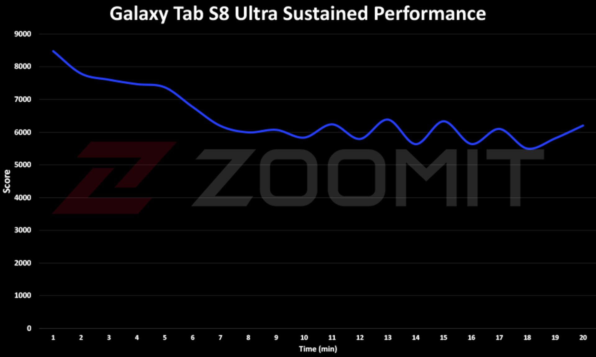 براساس تستهای من، هنگامی که گلکسی تب اس ۸ اولترا تحت بار پردازشی سنگینی قرار میگیرد، از همان ابتدای کار، کاهش سطح عملکرد را آغاز میکند؛ بهطوریکه در طول ۲۰ دقیقه، شاهد افت ۳۵ درصدی عملکرد هستیم.