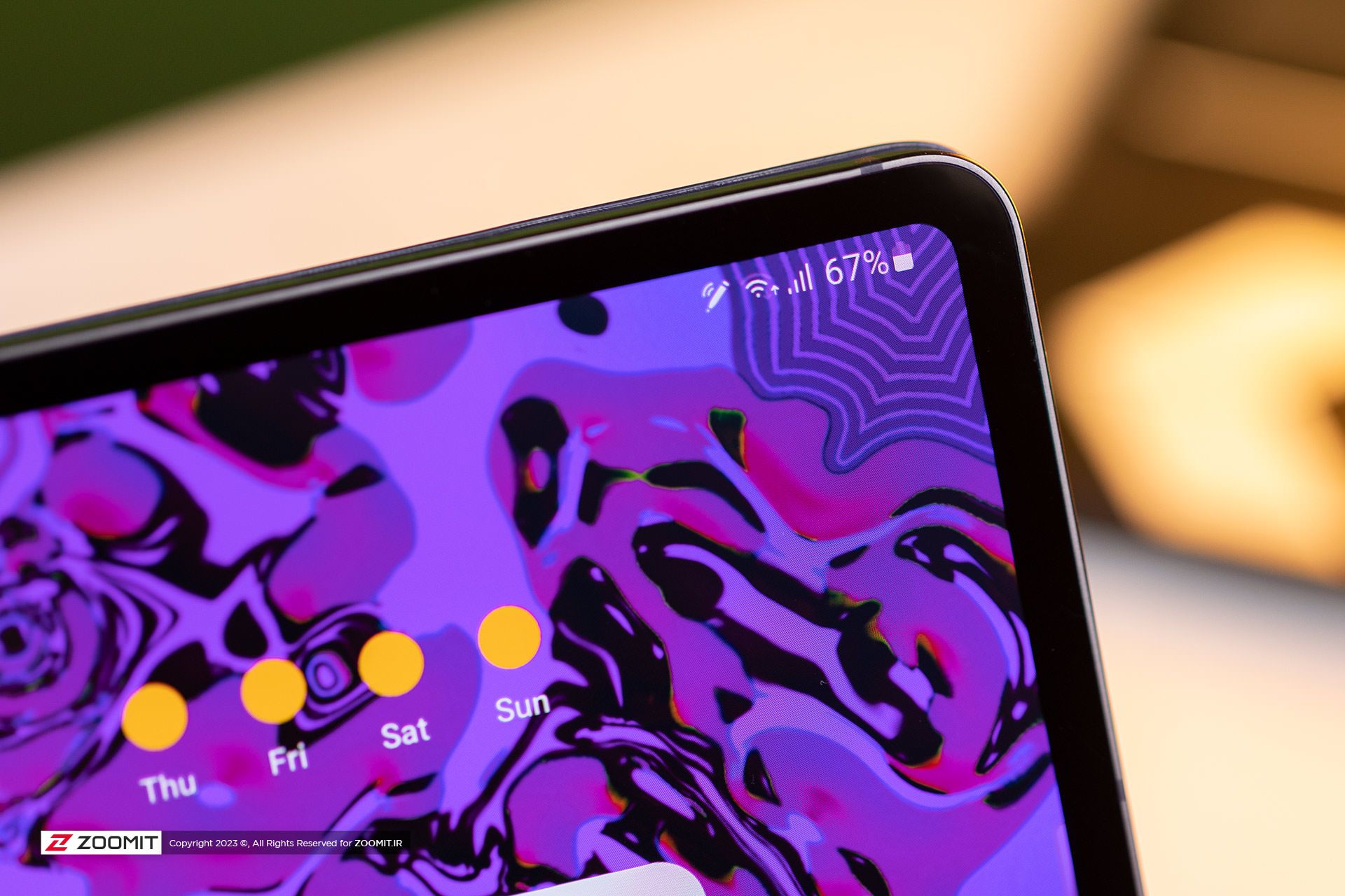 تنها ضخامت خود دستگاه باریک نیست؛ کرهایها حتی حاشیههای دورتادور صفحهنمایش را نیز باریک طراحی کردهاند؛ آنقدر باریک که دوربین سلفی دوگانهی تبلت در قالب یک بریدگی به درون نمایشگر نفوذ کرده است و آنقدر باریک که گاهی اوقات، هنگامیکه تبلت را در دست دارید، کف دستتان به صفحه برخورد میکند و در عملکرد لمسی دستگاه تداخل ایجاد میشود.
