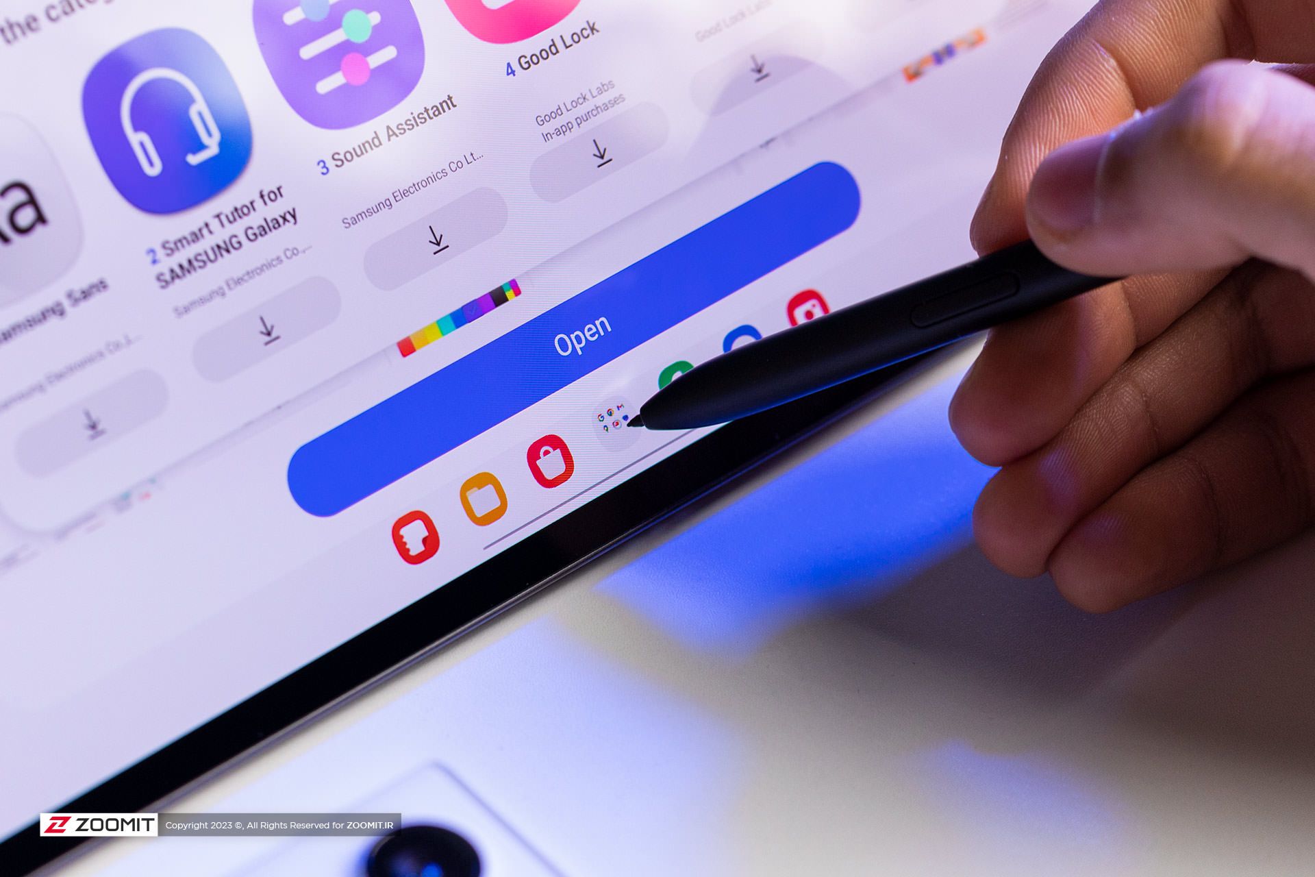 سامسونگ طراحی S Pen را نیز ارتقا داده؛ قلم جدید ابعاد بسیار خوبی دارد و با تأخیر فوقالعاده اندکِ ۲٫۸ میلیثانیهایاش بسیار سریع عمل میکند؛ حتی سریعتر از گلکسی تب اس ۸ پلاس (۶٫۵ میلیثانیه) و آیپد پرو (۹ میلیثانیه). از طرف دیگر، نرمبودن نوک قلم، باعث میشود تا حسوحال شبیه قلم و کاغذ واقعی را تجربه کنید.