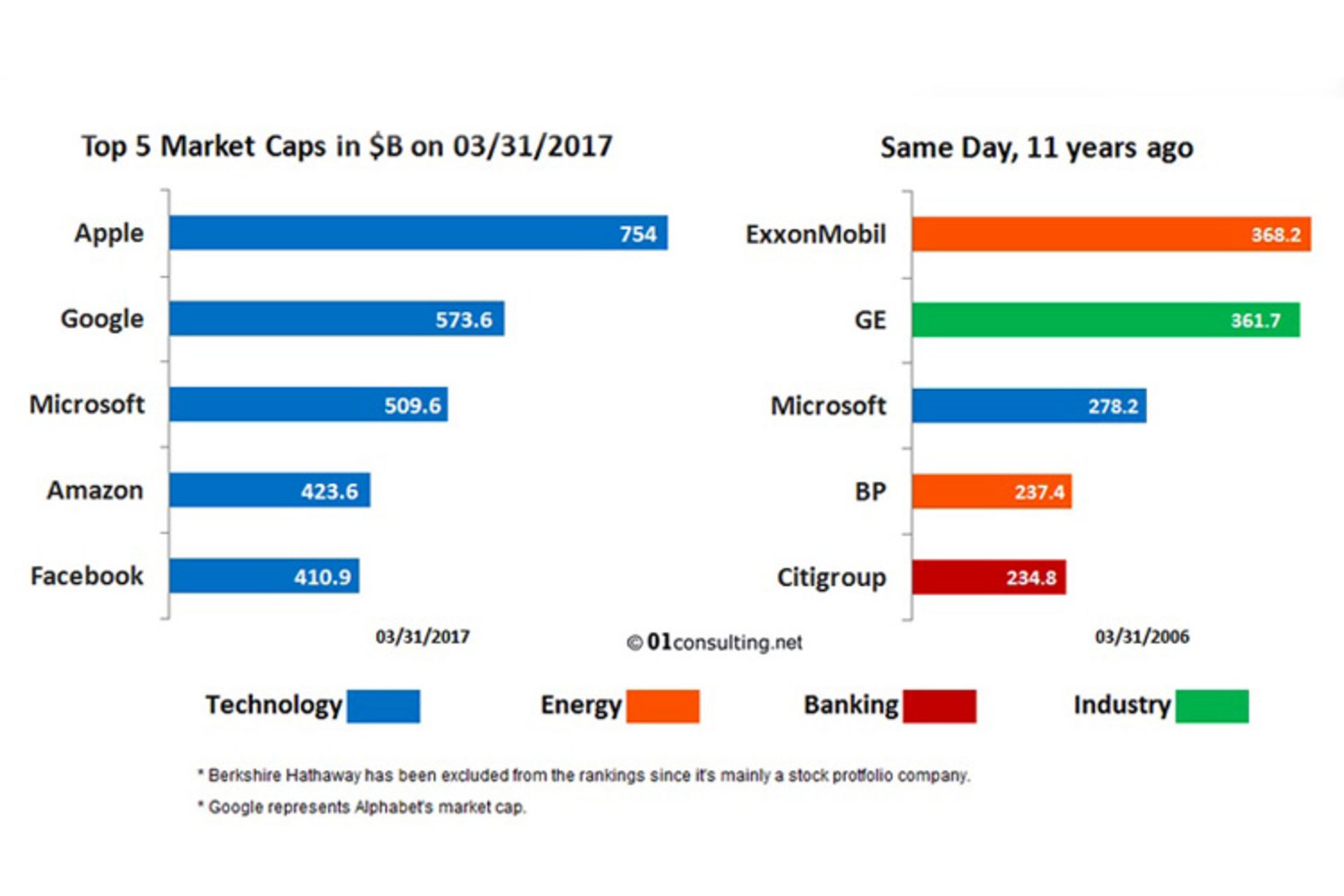 امروزه در لیست باارزشترین کمپانیهای جهان، هر پنج رتبهی اول در اختیار کمپانیهای حوزهی فناوری است. این اطلاعات برگرفته از لیستی است که کمپانیها را بر اساس ارزش بازار یا ارزش مجموع سهام هر کمپانی بر پایه ارزش هر سهم در روز جمعه، ۳۱ مارس به نمایش گذاشته است. لیست مربوط به باارزشترین کمپانیهای فعال در تالار بورس در ۳۱ مارس سال ۲۰۰۶ روایت دیگری از وضعیت کمپانیها در والاستریت حکایت میکند. در لیست باارزشترین کمپانیها در ۳۱ مارس ۲۰۰۶، تنها مایکروسافت جزو ۵ کمپانی برتر قرار دارد و خبری از چهار کمپانی دیگر نیست. در لیست ۱۱ سال پیش میتوان انواع کمپانیهای فعال در حوزههایی نظیر گروههای صنعتی، مؤسسات مالی و اعتباری و کمپانیهای نفتی را مشاهده کرد.
