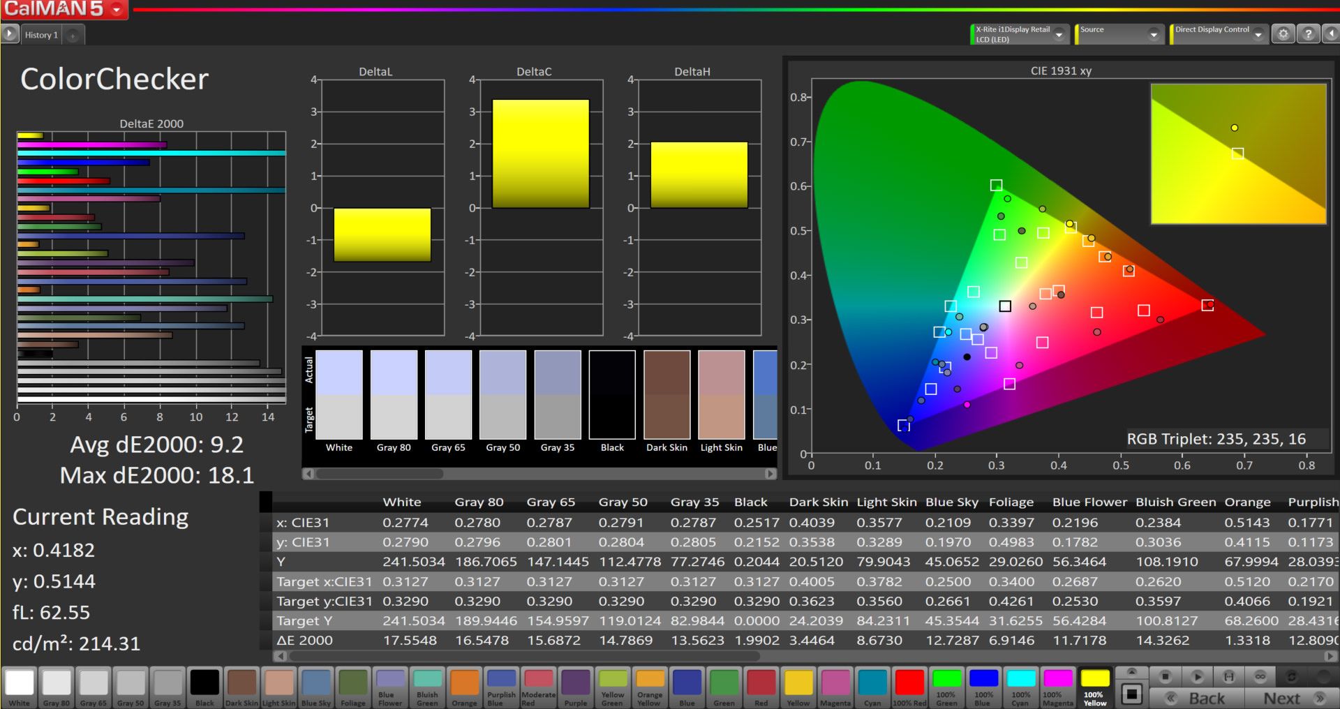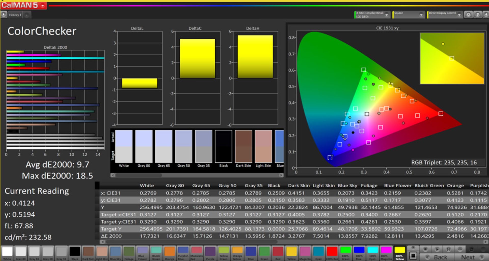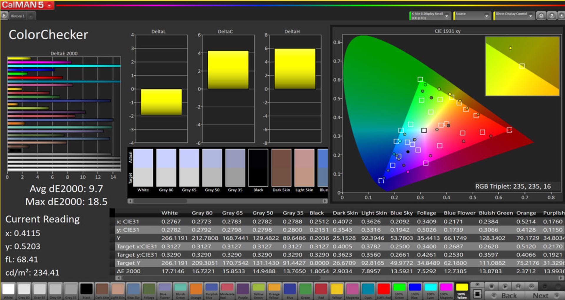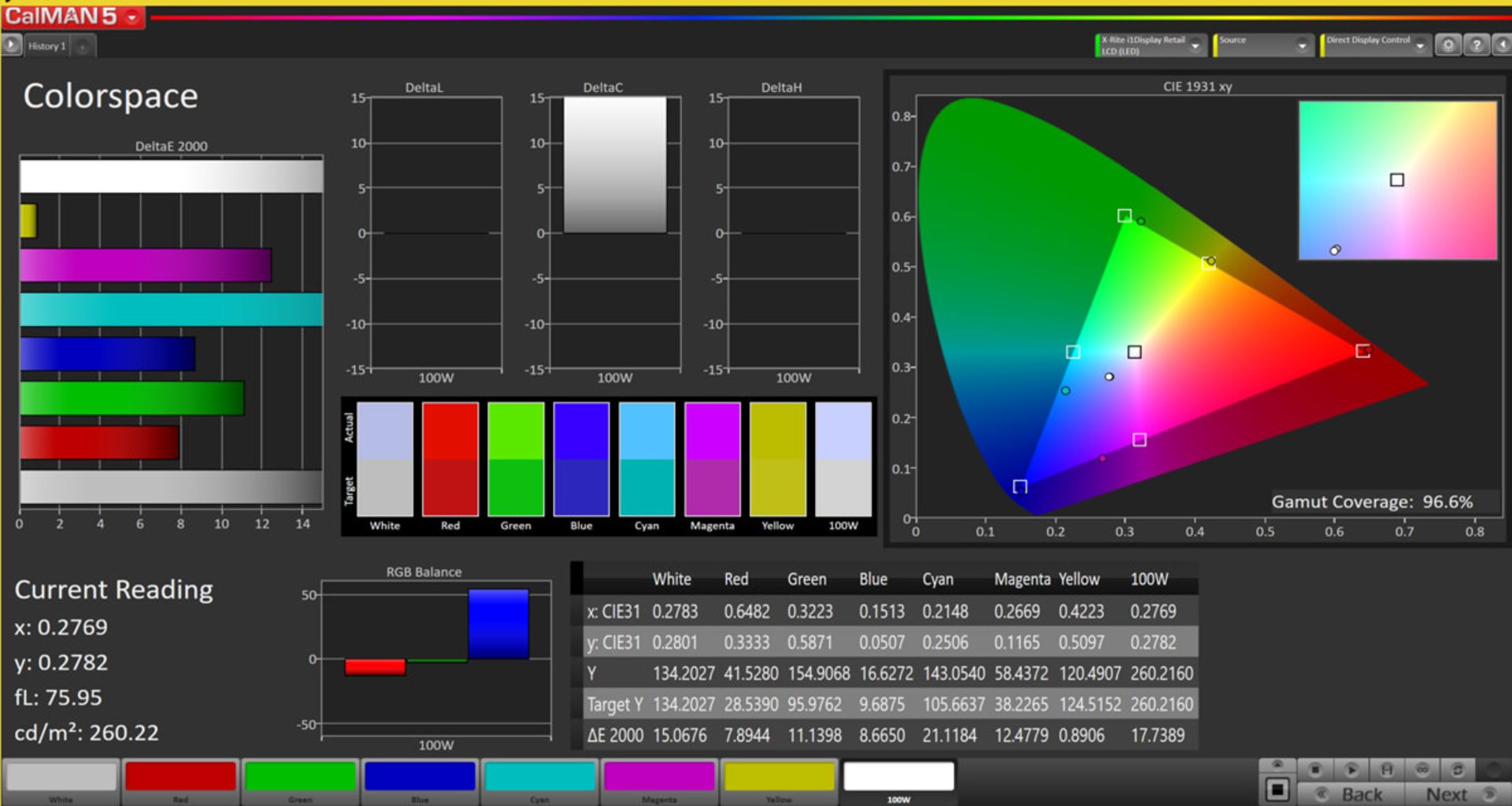 همانطور که اشاره کردیم، تفاوت فاحشی بین حالتهای تصویر چه از نظر روشنایی و چه از نظر رنگها مشاهده نمیشود؛ رنگ سفید با تمایل شدید خود به سردی بیشترین انحراف را از معیار در همهی حالتها دارد. 43XT725 همچون رقبا از فضای رنگی گسترده پشتیبانی نمیکند؛ پوشش فضای رنگی sRGB نیز در هر چهار حالت حدود ۹۶.۵ درصد است. بین حالتهای تصویر، فیلم با dE حدودی ۹.۲ کمترین خطای میانگین را دارد؛ در تمام آزمایشهای ما اسلایدر Backlight روی حداکثر تنظیم شده بود. در ادامه میتوانید نتایج حاصل از تستهای دقت رنگ و فضای رنگی را مشاهده کنید: