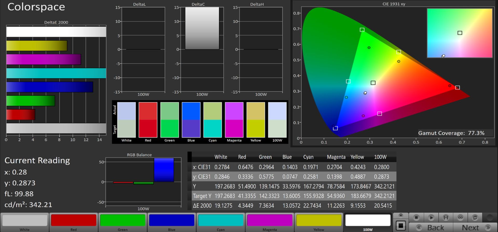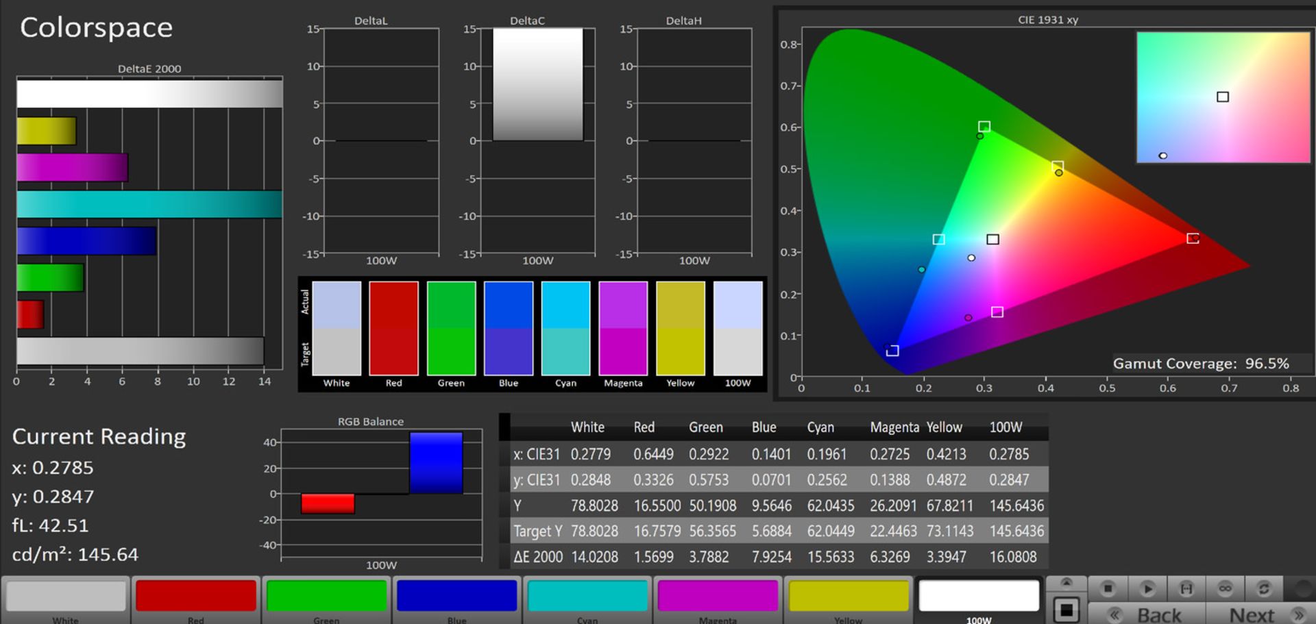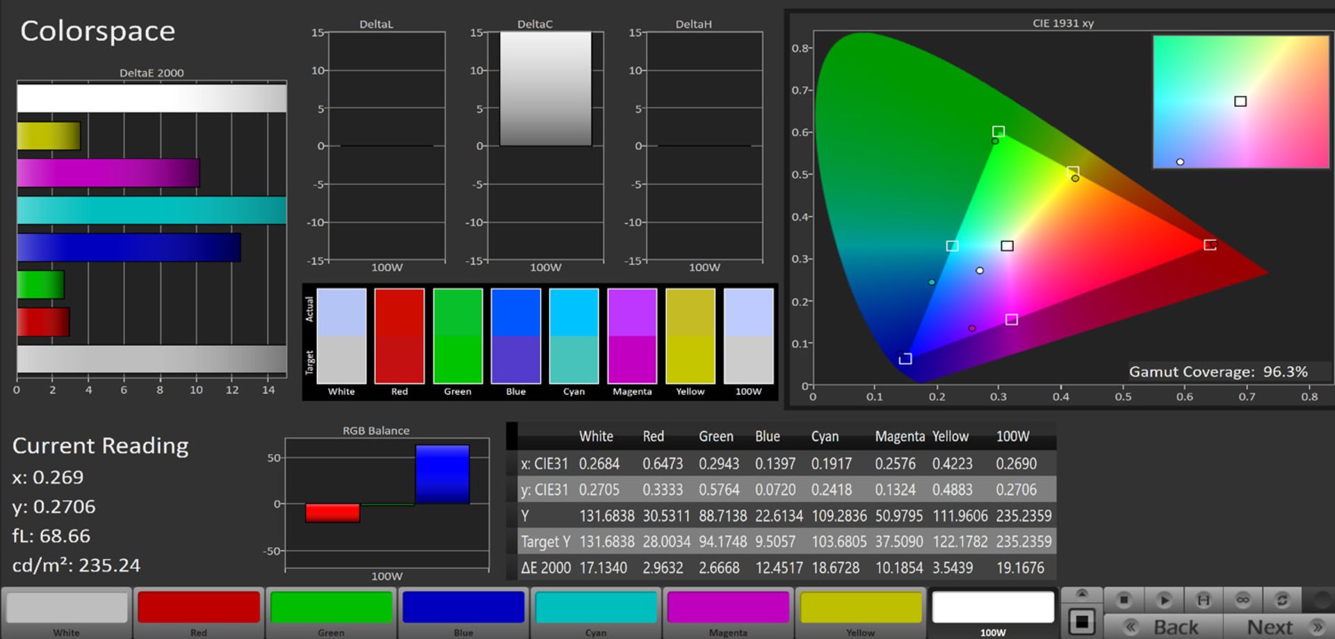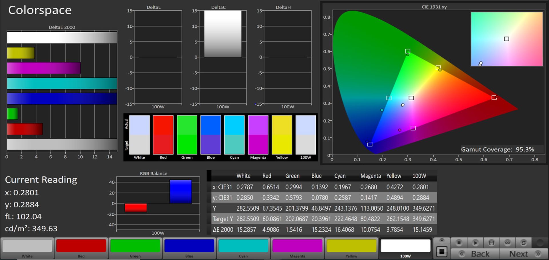 حالت تصویر | پوشش sRGB | پوشش DCI-P3 | میانگین خطا در sRGB (حالت Normal) | میانگین خطا در sRGB (حالت Warm) |