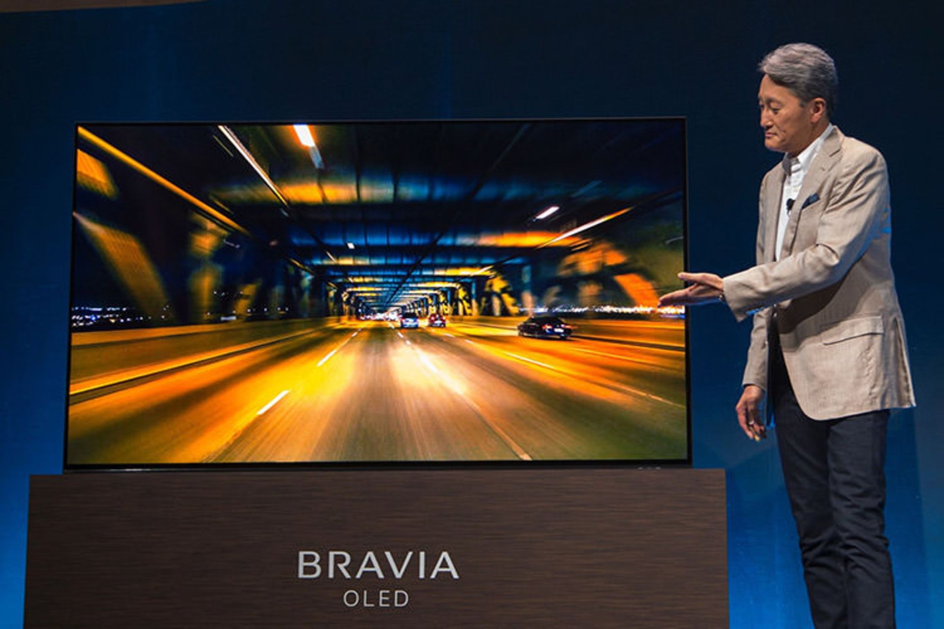 کاز هیرای در حال معرفی تلویزیون اولد براویای سونی در جریان نمایشگاه CES 2017