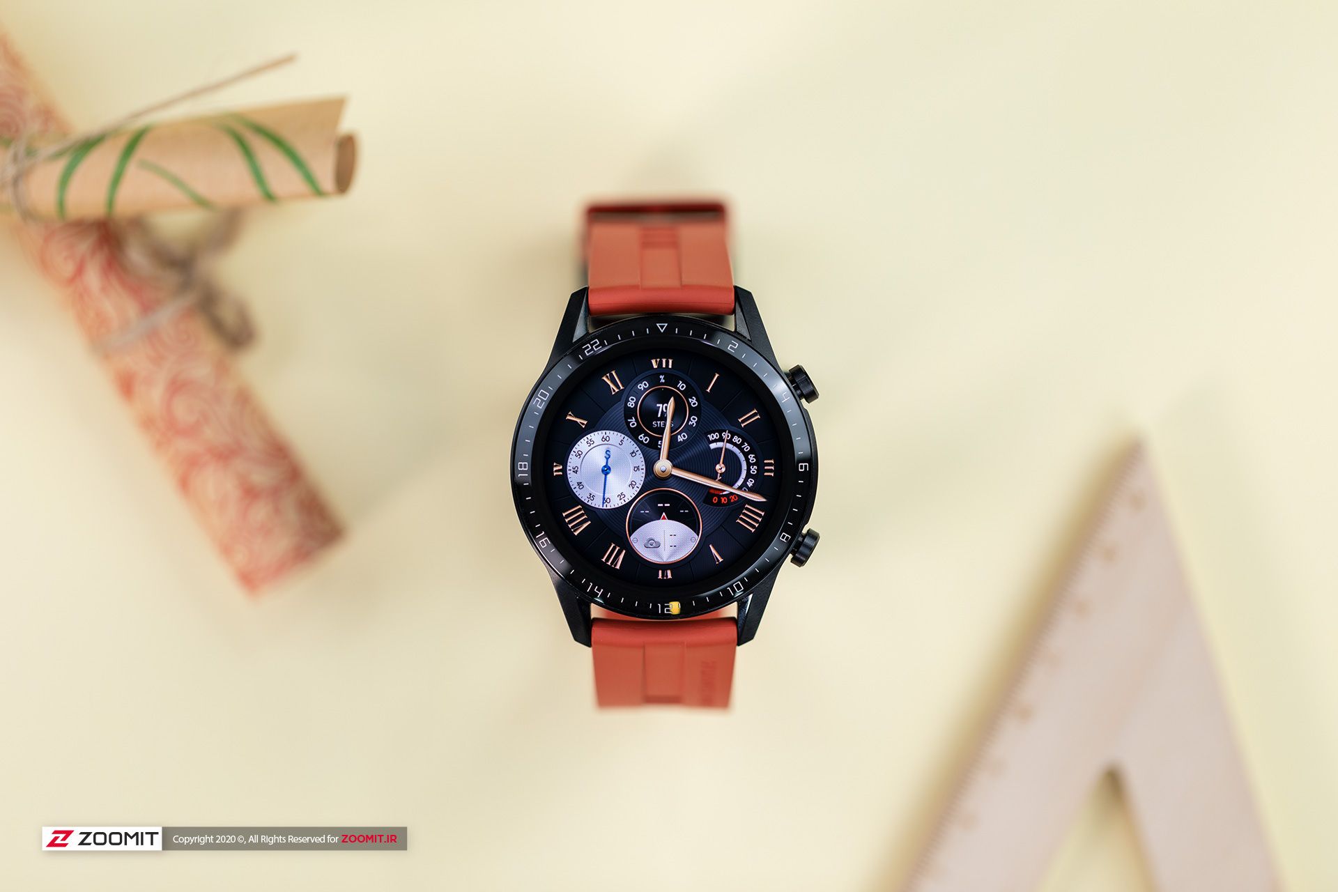 هواوی واچ جیتی ۲، در دو اندازه ۴۶ و ۴۲ میلیمتری، همزمان با رونمایی از گوشیهای میت ۳۰ و میت ۳۰ پرو هواوی معرفی شد و هواوی بهبودهایی چون پردازندهی توانمندتر و قابلیتهای بیشتر در ردیابی ورزشی، امکان مکالمهی صوتی و عمر باتری بیشتر را به آن بخشید. ساعتهای نسل دوم Watch GT تفاوتهایی با نسل پیشین خود دارد و هواوی امسال بهبودهای قابل توجهی در ساختار طراحی آنها لحاظ کرده است. نمونهای که برای بررسی دراختیار زومیت قرار دارد نسخه ۴۶ میلیمتری جیتی ۲ است. نسخهای اسپرت با طراحی مدرن نسبت به نسخه ۴۲ میلیمتری؛ هواوی در نسخهی کوچکتر از طراحی ظریف و سادهای استفاده کرده که بیشباهت به گلکسی واچ اکتیو ۲ نیست. در مقابل، نسخه ۴۶ میلیمتری این ساعت با طراحی خاص و بهروز، علاقهمندان به این سبک را میتواند شیفته خود کند.