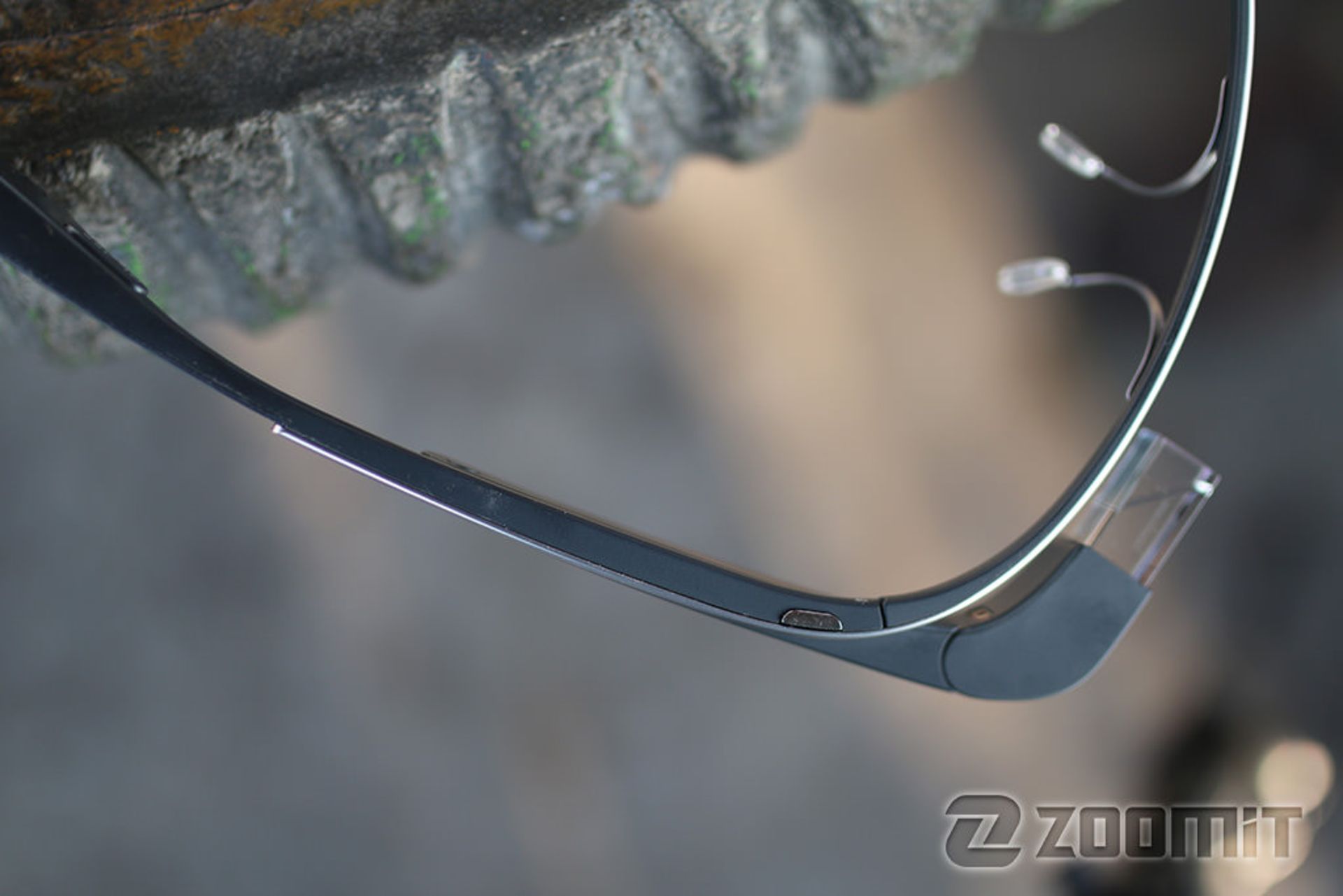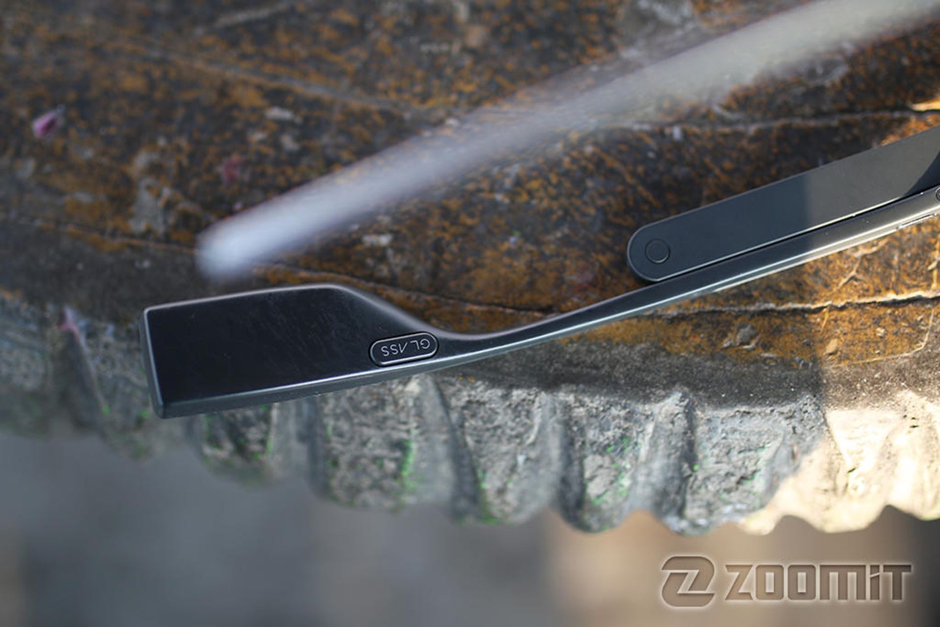 در سمت راست عینک، بخشی ضخیمی وجود دارد که جایگاه باتری و همه تجیزات الکترونیکی دستگاه است. دکمهها، پد لمسی و بلندگوها همگی در این بخش ضخیم جای گرفتهاند.